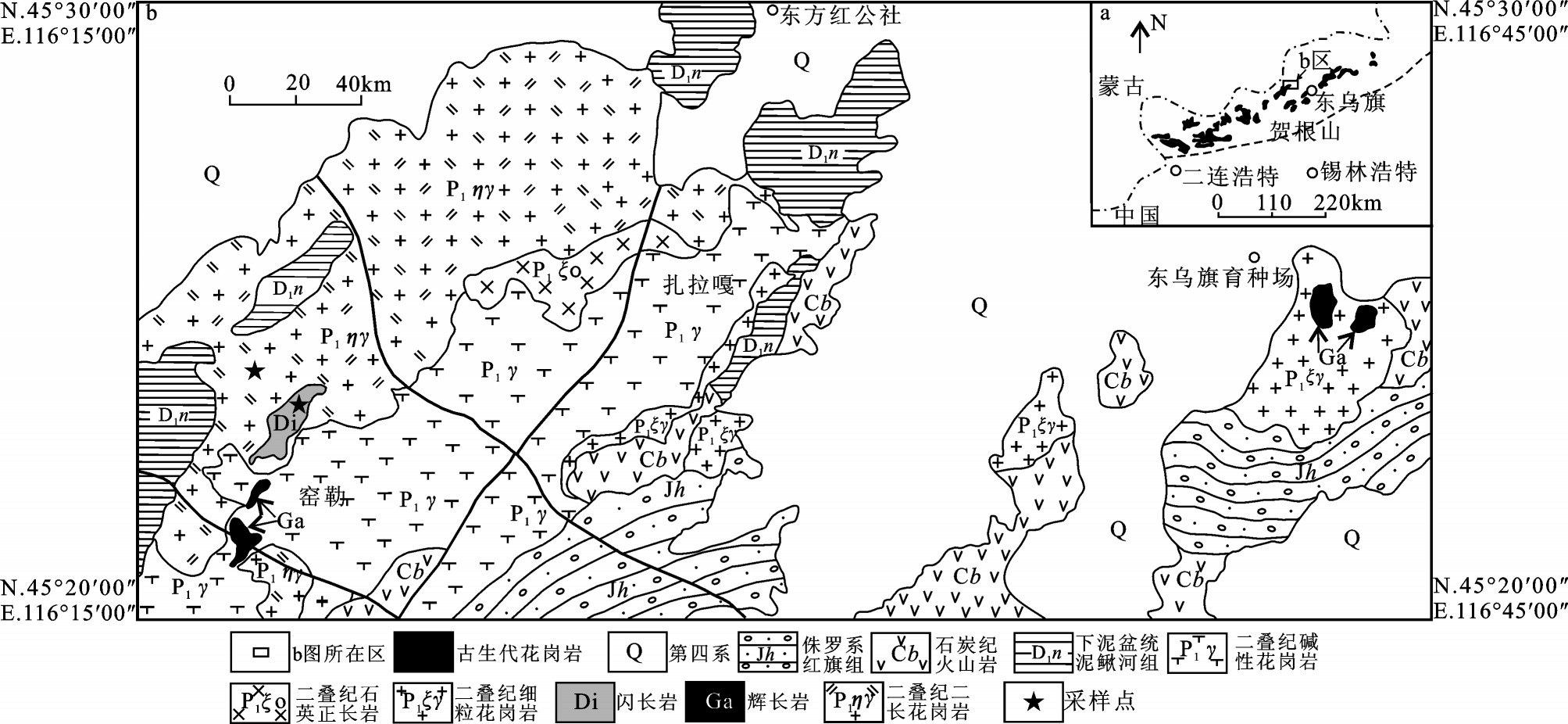 1 区域地质背景及岩体特征 1.1 区域地质背景研究区位于贺根山断裂带以北的二连—东乌旗晚古生代构造岩浆岩带上(图1)。区内地层从泥盆系到第四系出露较全,主要有中下泥盆统泥鳅河组、中上泥盆统塔尔巴格特组、上石炭统宝力高庙组、格根敖包组、下侏罗统红旗组。泥盆系,特别是泥鳅河组地层含有较多的腕足、珊瑚、海百合等海相化石,夹有薄层灰岩透镜体,为一套稳定的滨浅海相沉积;上石炭统宝力高庙组与安格尔音乌拉组呈平行不整合接触,为陆相火山岩-碎屑岩建造;格根敖包组与宝力高庙组同时异相,下部为一套海相火山岩,上部为碎屑岩建造。红旗组为一套河流相粗碎屑岩。侵入岩以晚古生代花岗岩为主,侵入到早期地层,被下侏罗统红旗组底部砾岩、含砾粗砂岩不整合覆盖。区内火山岩非常发育,晚古生代火山活动强烈。巴彦都兰、塔本陶包格、架斯图乌拉等地可见花岗岩侵入到泥鳅河组地层中,其与岩体接触部位泥质成分较高的泥质粉砂岩发生接触-热变质,形成宽数厘米至几十厘米的斑点角岩,局部可见花岗岩捕掳泥鳅河组地层。