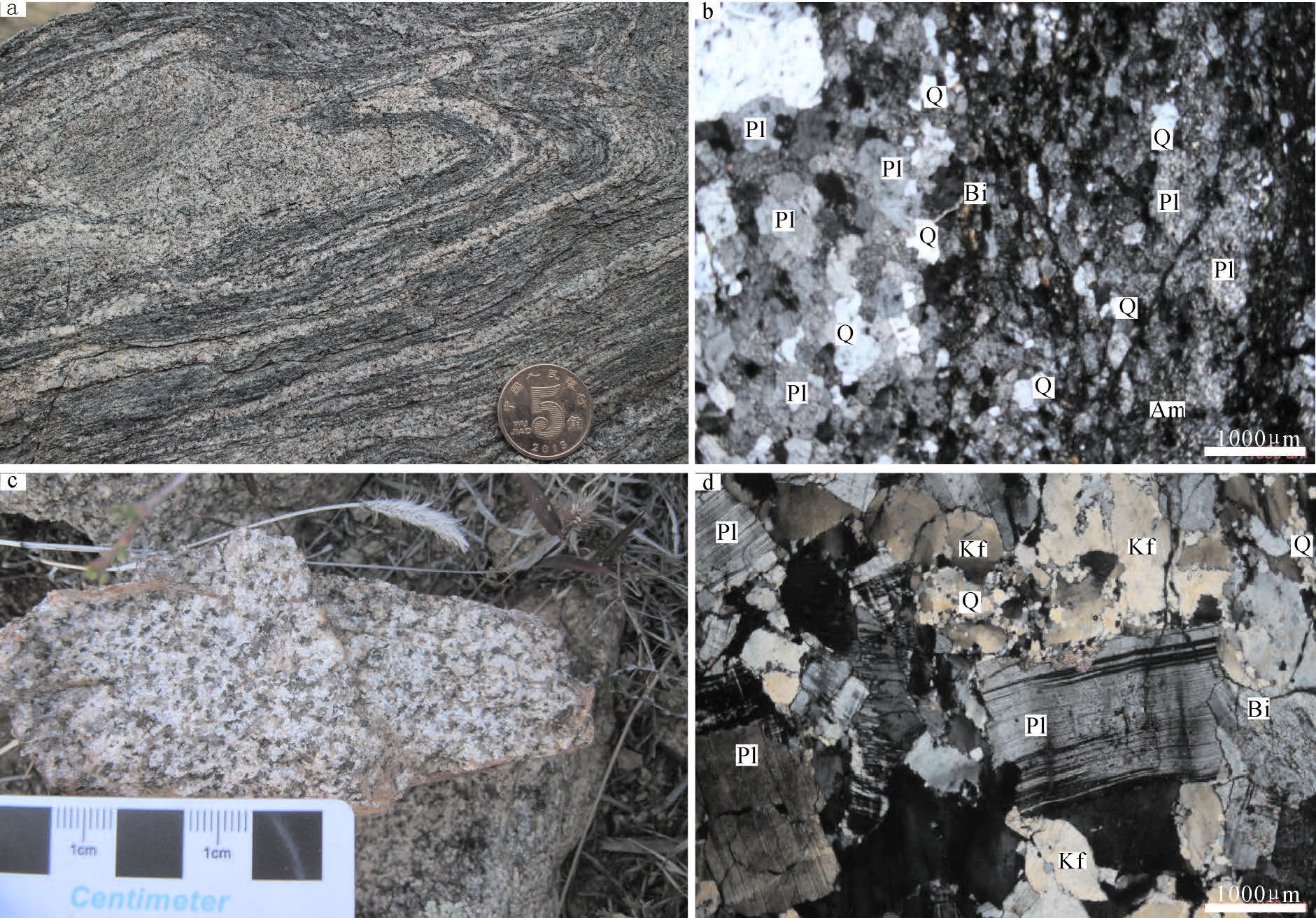 闪长岩整体呈NE向展布,岩株状产出,边部变形强烈。岩体北侧和南侧分别被中细粒二长花岗岩和中粗粒正长花岗岩侵入,岩体内发育一组NEE向辉绿岩脉,规模较大,延伸数百米。闪长岩中片麻状构造被二长花岗岩和中粗粒正长花岗岩岩体截切,据此可以判定闪长岩侵位更早。岩体片麻状构造是由长英质矿物石英、长石与镁铁质矿物云母、角闪石定向平行排列组成(图2-a),长英质矿物一般厚度为0.2~3 cm,镁铁质矿物较薄,厚度一般小于2 cm。薄片鉴定特征:片麻状闪长岩。主要由斜长石组成,含少量石英、角闪石、黑云母。斜长石呈半自形板状—他形粒状定向分布(图2-b)。
