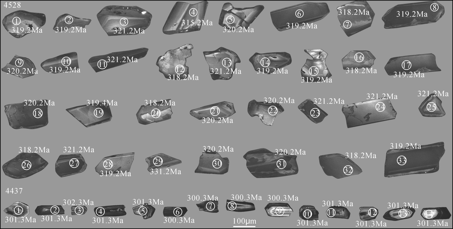 样品4437 中14 个分析点年龄分布较为集中(图4),都位于谐和线上,其206Pb/238U表面年龄在置信度95% 时的加权平均值为(300.8 ± 1.7)Ma(MSWD=0.031)。因被测锆石为岩浆成因锆石,且被测点均位于锆石震荡环带,故该年龄应代表样品4437 锆石的结晶年龄,即中细粒黑云二长花岗岩的侵位时代为早二叠世早期。