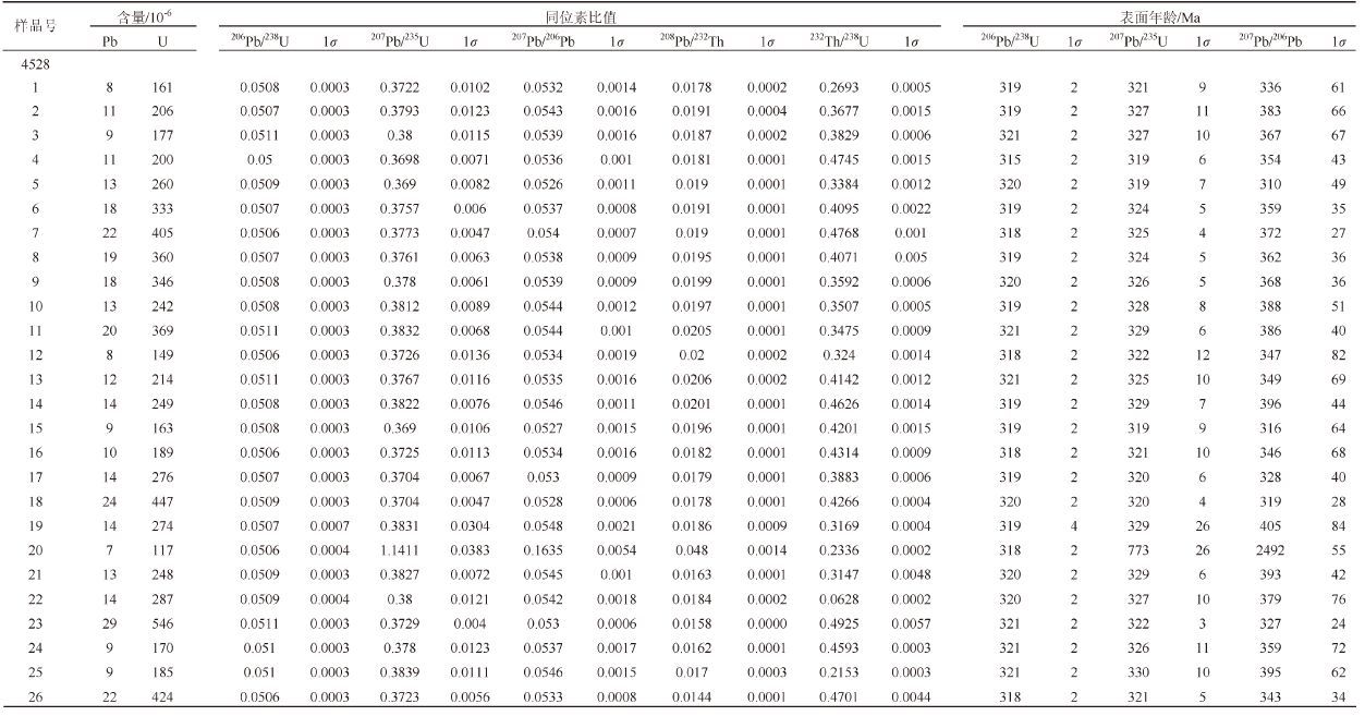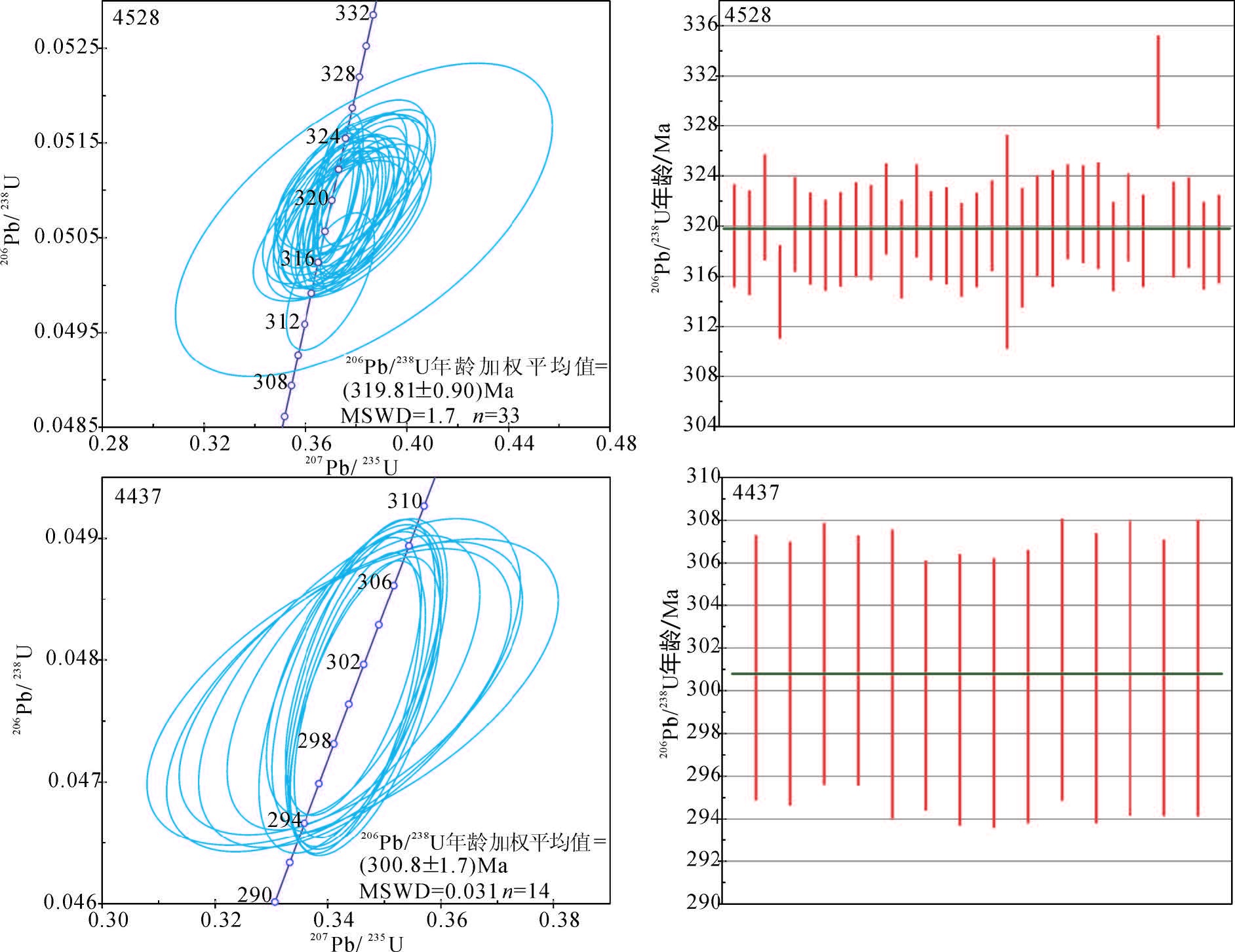 样品4528(闪长岩)(图4)有33 粒锆石测点,各测值的206Pb/238U 非常均一((315±2)~(331±2))Ma,其中20 粒锆石可能是由于普通Pb 加入造成偏离谐和线较远。33 粒锆石206Pb/238U表面年龄加权平均值为(319.8±0.9)Ma(MSDW=1.7)。综上认为,该年龄可以代表样品4528的成岩年龄。