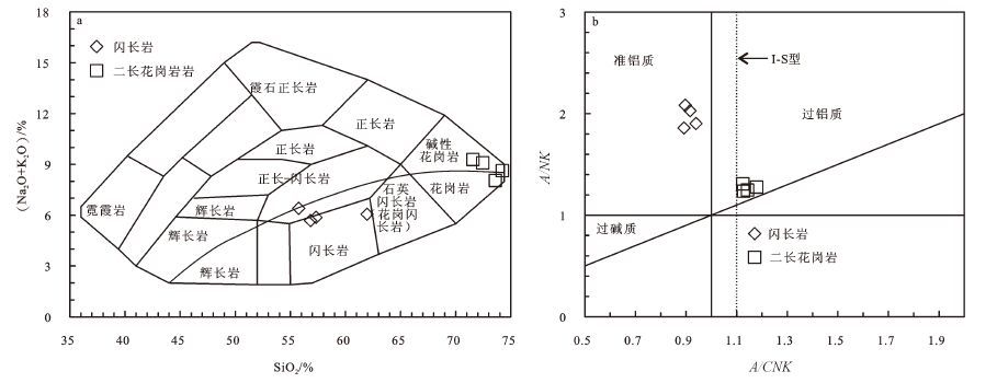 图5 东乌旗闪长岩、二长花岗岩硅-碱(a)和A/CNK-A/NK(b)图解(底图据文献[28, 29]) Fig.5 Diagram of the total ALKalis versus silica (TAS) (a) and A/CNK-A/NK (b) for diorite and monzonitic granite in Dong UjimqinBanner (after references [28, 29]) |