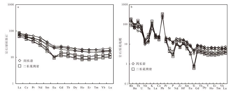 (2)闪长岩明显富集Rb、K等大离子亲石元素(LILE),亏损Ba、Sr,相对亏损Ta、Nb和Ti 等高场强元素(HFSE);二长花岗岩以高钾、富碱、弱过铝质为特征,富集部分大离子亲石元素(LREE、Rb、K等);Zr 弱负异常、Hf 弱正异常,亏损Sr、Nb、Ta、P、Ti,二长花岗岩正交偏光下,斜长石聚片双晶发生轻微弯曲变形,显示后造山花岗岩特征。