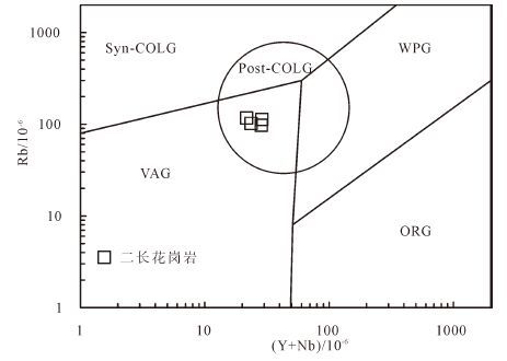 图7 东乌旗二长花岗岩的(Y+Nb)-Rb图解 VAG—火山弧花岗岩;WPG—板内花岗岩;Syn-COLD—同碰撞花岗岩;Post-COLD—后碰撞花岗岩;ORG—洋中脊花岗岩 Fig.7 (Y+Nb)-Rb dimgram of the monzonitic granite in DongUjimqin Banner |