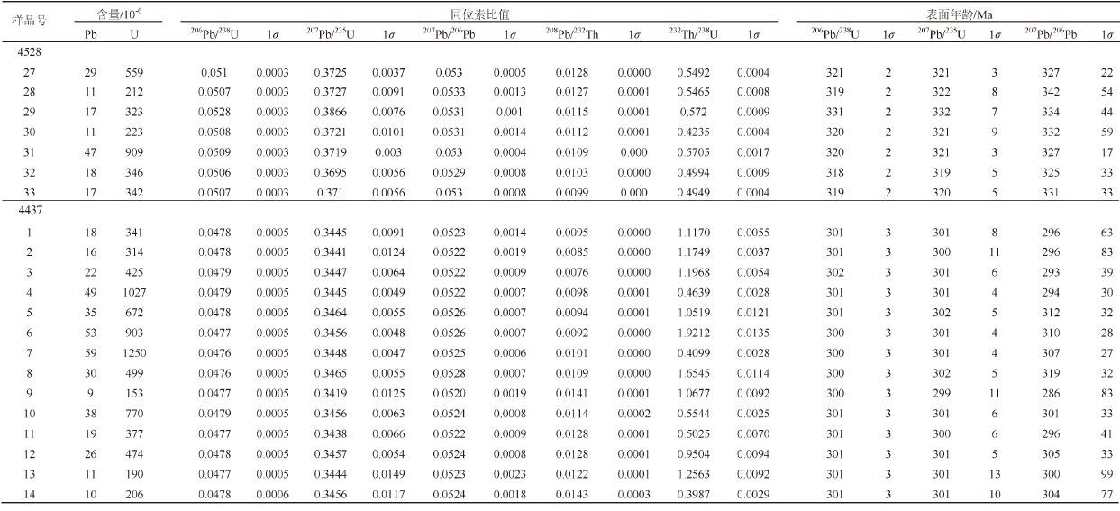 通过透射光、反射光和阴极发光图像对样品4528、4437 分别选取无裂纹发育、无包裹体发育、晶形、阴极发光特征典型的锆石进行了LA-ICP-MSU-Pb分析,分析结果见表2。