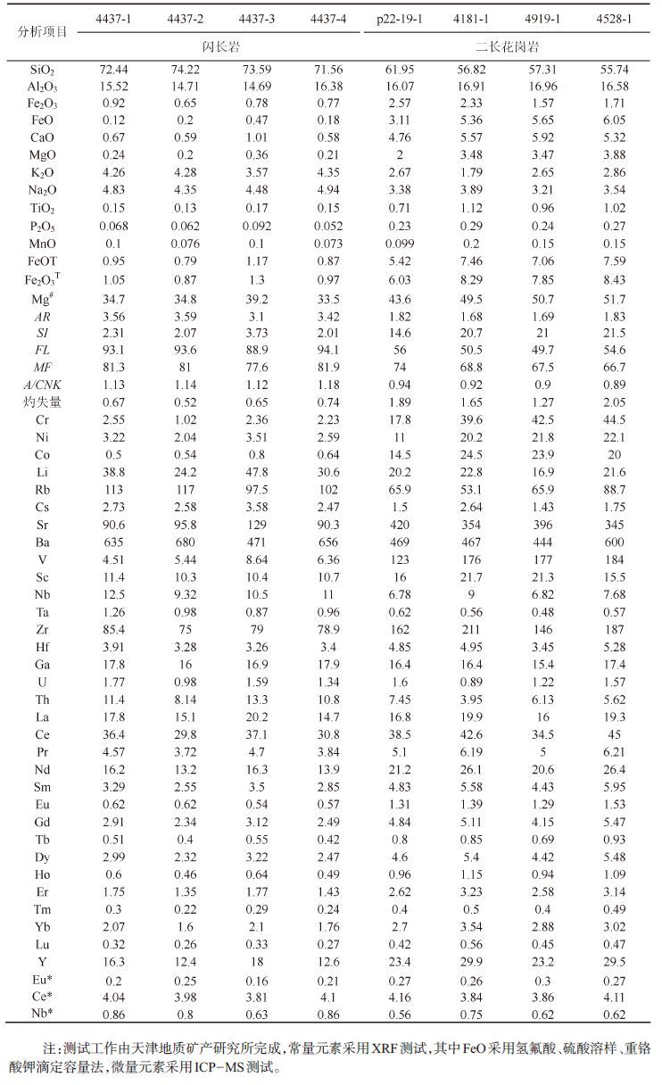 | 表3 东乌旗闪长岩、二长花岗岩主量元素(%)、微量元素(10-6)分析结果 Table 3 Major (%) and trace elements (10-6) compositions of the monzonitic granite in Dong Ujimqin Banner |