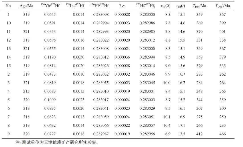 闪长岩锆石Hf 同位素数据见表4,闪长岩4528的15 个测点的(176Hf/177Hf)i值为0.282956~0.283057,εHf(t)值为14.6~17.1,测点2、3、6、7、8 的地壳模式年龄值比岩石U-Pb 年龄小,为试验测试误差所致,闪长岩地壳模式年龄(tDMc)为335~466 Ma。同位素数据显示,晚石炭世早期闪长岩以正的锆石εHf(t)(14.6~17.1)为特征,具有年轻的锆石地壳模式年龄335~466 Ma。