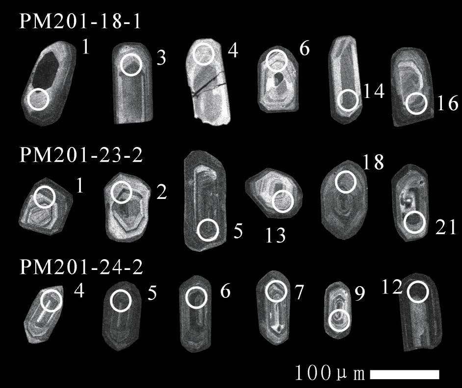 2 锆石年代学 2.1 样品制备及测试本文采集的样品采用常规方法进行粉碎、筛选、清洗和烘干,然后采用磁选和重液分选出锆石晶体,随后在双目镜下挑选透明度和晶形较好、无明显裂痕的锆石颗粒置于双面胶上,灌上环氧树脂制靶,固化后打磨抛光使锆石内部结构暴露,用于透射光、反射光、阴极发光(CL)锆石图像采集和锆石原位单点U-Pb 定年。样品的破碎和锆石挑选由河北省廊坊市宇能矿物分选有限公司完成,背散射图像在吉林大学完成,锆石阴极发光图像(CL)采集在中国科学院地质与地球物理研究所完成。