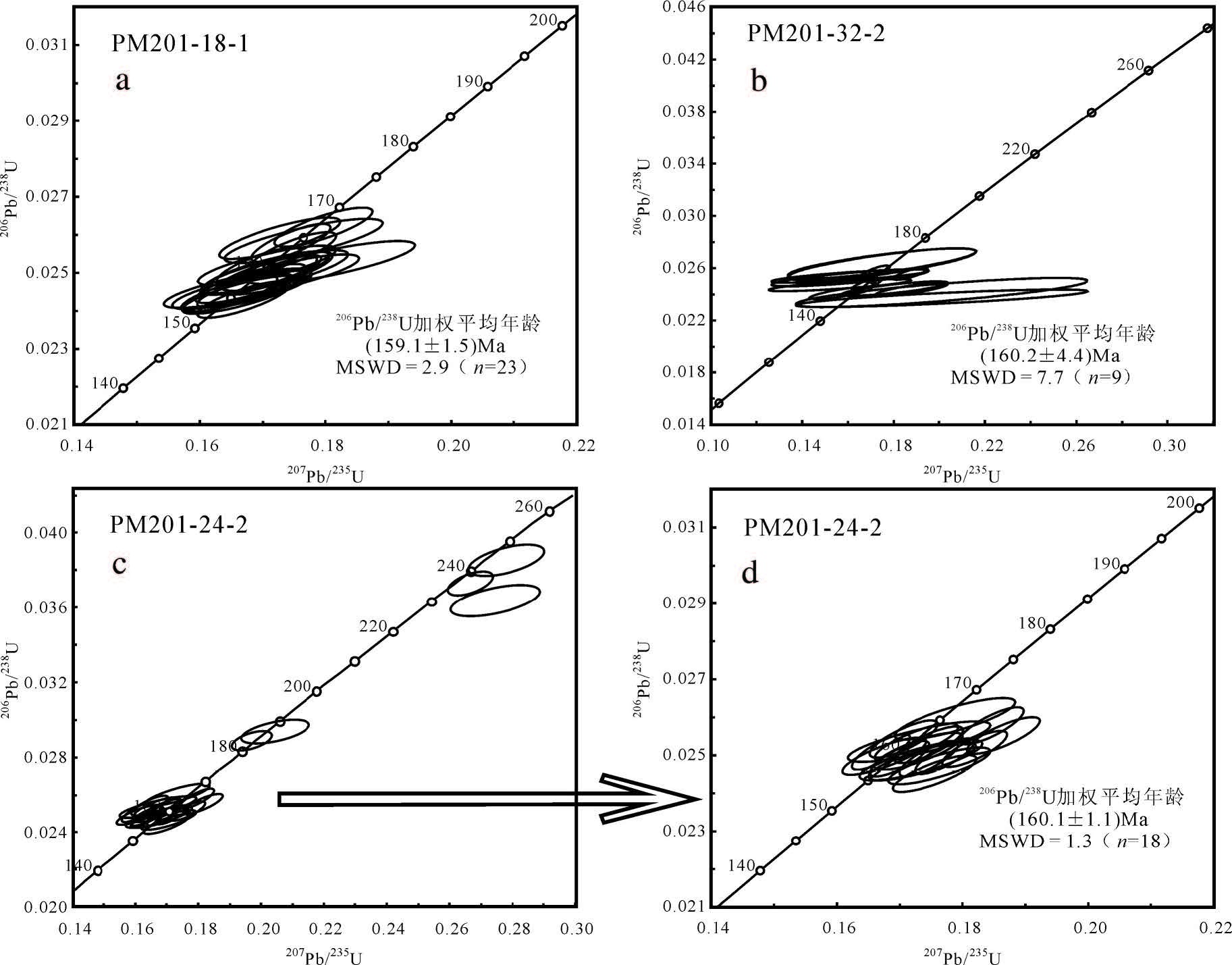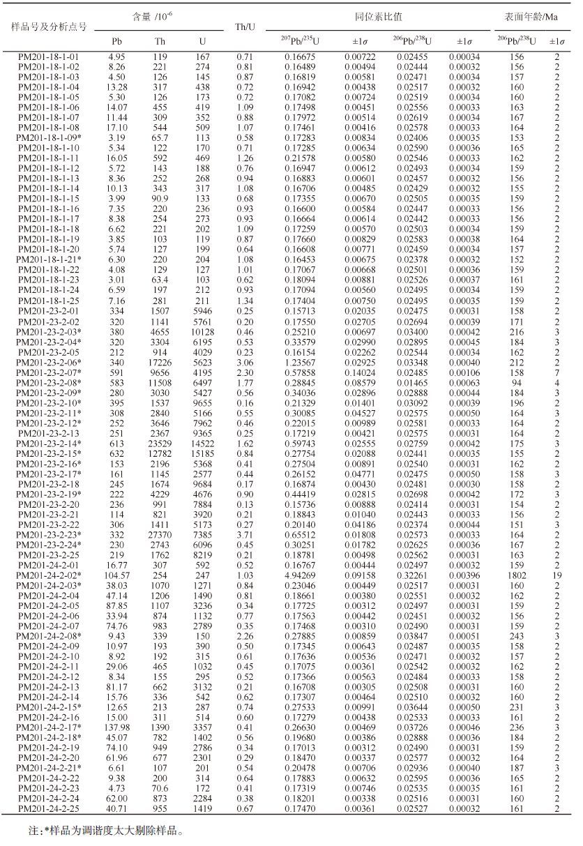 样品PM201-24-2,岩性为斑状黑云母二长花岗岩。锆石晶型良好,多为柱状,具有岩浆振荡型环带,锆石的Th/U 比值较高(0.21~0.81),显示岩浆成因特征[38, 39, 40]。该样品共进行了25 个锆石颗粒的测定,其中3 号点调谐度很高故舍掉,2、8、15、17、18、21 等6 个点数据年龄为(1802±19) Ma、(243±3) Ma、(231±3) Ma、(236±3) Ma、(184±2) Ma和(187±3) Ma,为捕获锆石(图3-c)。其余18 个点均在谐和曲线上或附近(图3-d)。206Pb/238U 加权平均年龄为(160.1±1.1) Ma,MSDW=1.3,代表了样品PM201-24-2岩浆结晶年龄。