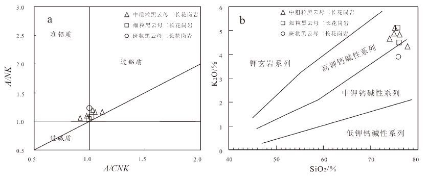 图4 烧锅营子岩体的A/CNK-A/NK(a)及SiO2-K2O(b)图解 Fig.4 A/CNK-A/NK (a) and SiO2-K2O (b) patterns of Shaoguoyingzi intrusion |
