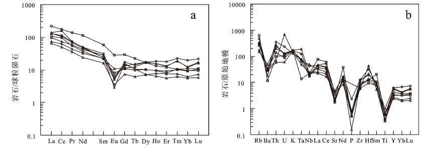 岩石稀土总量ΣREE 除1 个样品较高(249.84×10-6)外,其他稀土总量都比较低,92.06 × 10-6~169.03×10-6,平均含量为137.61×10-6。轻重稀土比值为6.06~20.09,在稀土元素球粒陨石标准化图解上(图5-a)可以看出,轻重稀土分馏明显,重稀土呈比较平坦分布。δ Eu 为0.08~0.60,具有中等-比较强烈的负铕异常。