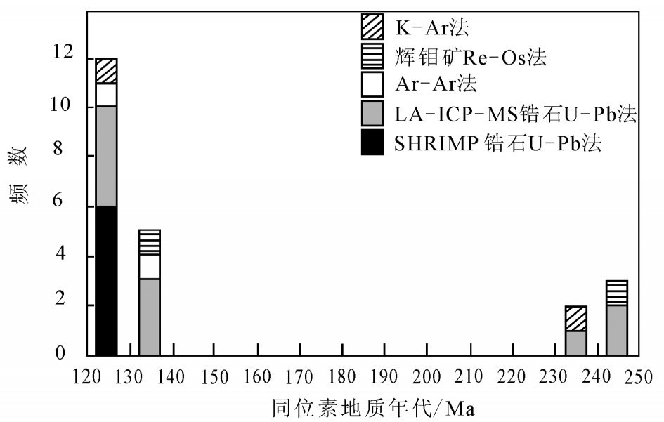 图6 赤峰-朝阳地区主要金矿床同位素年龄直方图 Fig.6 Histogram of the geochronological data of the majorgold deposits in Chifeng-Chaoyang area |