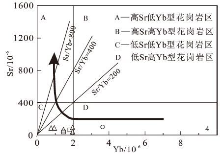 图7 烧锅营子岩体Sr-Yb图(图例同图4) Fig.7 Sr-Yb diagram of Shaoguoyingzi intrusion (legends asfor Fig.4) |