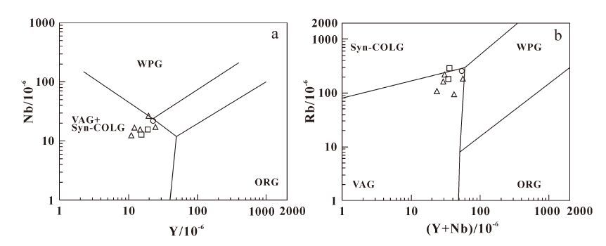 图8 烧锅营子岩体的Y-Nb(a)和(Y+Nb)-Rb(b)图解(图例同图4) Fig.8 Nb-Y and Rb-Y+Nb patterns of Shaoguoyingzi intrusion (legends as for Fig.4) |