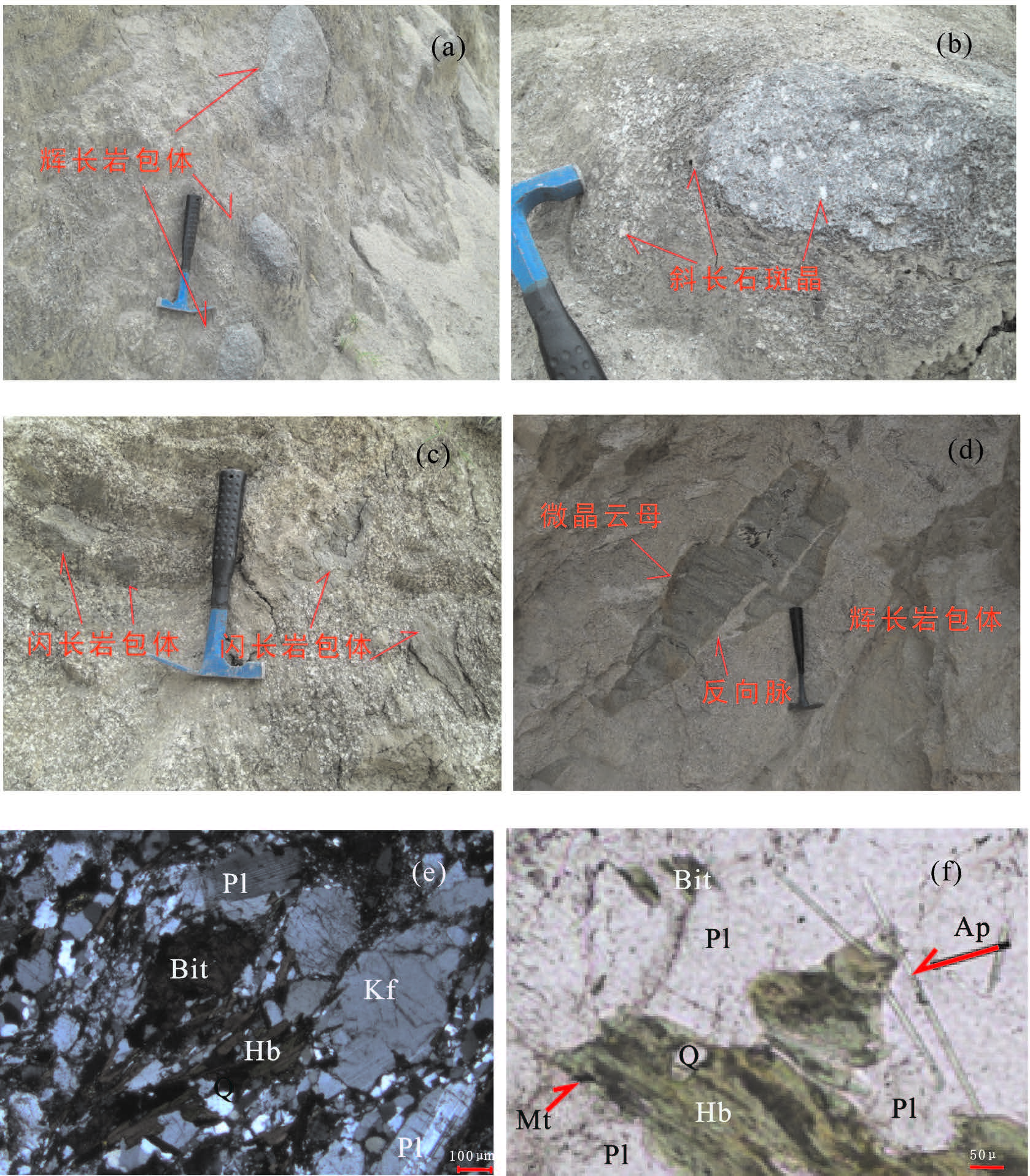 花岗闪长岩和闪长岩的野外露头及镜下特征 a~d—花岗闪长岩和闪长岩包体的野外露头;e—花岗闪长岩的镜下特征(正交偏光);f-闪长岩包体的镜下特征(单偏光);Kf—钾长石;Q—石英;Pl—斜长石;Bit—黑云母;Hb—普通角闪石;Ap—磷灰石;Mt—磁铁矿 Fig.2 Structural and fabric characteristics of the granodiorlte and diorite a-d-Photographs of granodiorlte samples; e-Microphotographs of granodiorlte samples; f-Microphotographs of diorite samples;Kf-Potash feldspar; Q-Quartz; Pl-Plagioclase; Bit-Biotite; Hb-Hornblende; Ap-Apatite; Mt-Magnetite |