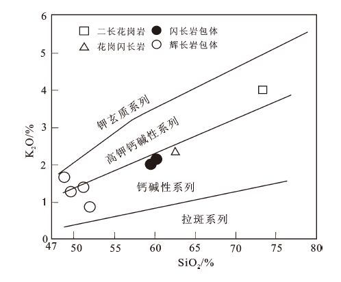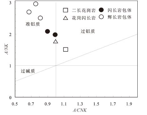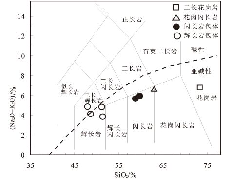 研究区闪长岩包体的SiO2 含量为48.02%~59.80% ,Na2O + K2O=3.89% ~5.95% ,高K2O 含量(0.94%~2.12%),贫钾K2O/Na2O=0.32~0.56;低P2O5含量(0.12% ~0.44% ) 为特征; MgO=2.39% ~7.07% .Mg#=48.10~54.2。表明斜长石结晶分离作用较强烈。在TAS 岩石分类图中(图3),该闪长岩包体样品落入闪长岩范围内。岩石样品落在虚线以下,主要属于亚碱性岩石(图3)。在A/CNK-A/NK 图解中,样品均落在准铝质花岗岩区域(图4)。Al2O3=17.09%~17.10%,铝饱和指数( A/CNK) 介于0.90~0.95,为准铝质花岗岩系列。在SiO2-K2O 图解中,大多数样品点落入钙碱性系列区域(图5)。在A/MF-C/MF图解中位于基性岩或变质火成岩的熔融区(图6)。反映闪长岩包体具有地慢原生岩浆的特点。