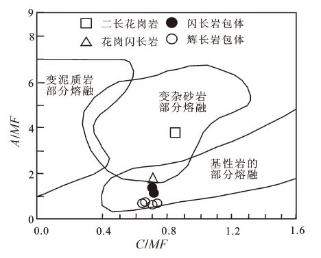 研究区寄主岩石黑云二长花岗岩、花岗岩闪长岩和闪长岩包体的锆石Hf 同位素研究结果表明[16],不同类型岩石的锆石Hf 同位素组成明显不同。其中,黑云母二长花岗岩锆石的176Hf/177Hf 比值较低,为0.282447~0.282547,对应的εHf(127 Ma)值为- 9.1~-5.4,TDM2Hf 值为1.5~1.7 Ga,远大于其U-Pb 年龄值。为来源于古老的地壳物质的部分熔融的产物。在AMF-CMF图解中,黑云二长花岗岩主要位于变质火成岩或杂砂岩的部分熔融区。因此黑云二长花岗岩浆可能来源于本区中元古代高黎贡山群的地壳物质的部分熔融。具有S 型花岗岩的特征。