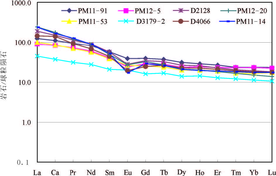 图7 滇西梁河县勐养岩体稀土元素配分样式图(标准化数据引自文献[24]) Fig.7 REE patterns for trace elements of Mengyang intrusionin western Yunnan (normalized data after Reference[24]) |
