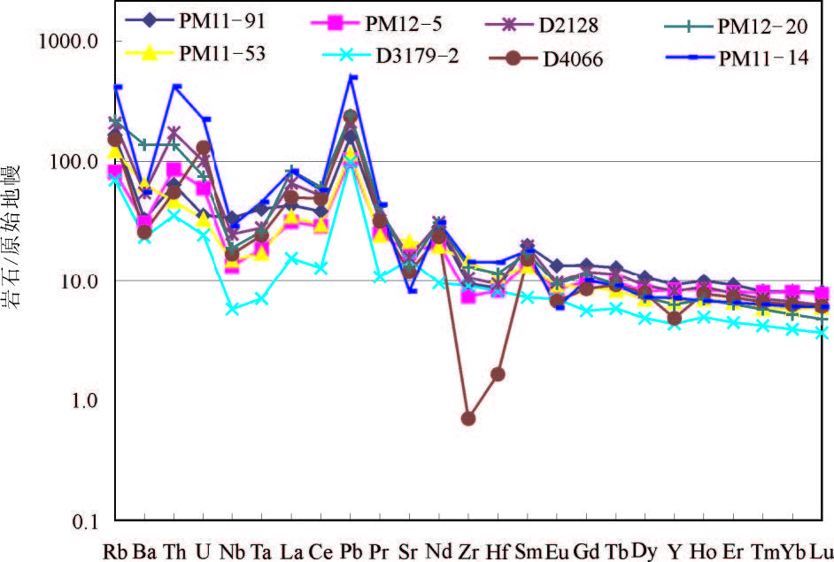 图8 滇西梁河县勐养岩体微量元素原始地幔标准化蜘蛛网图(标准化数据引自文献[24]) Fig.8 Normalized diagram for trace elements ofMengyang intrusion in western Yunnan(normalized data after Reference[24]) |