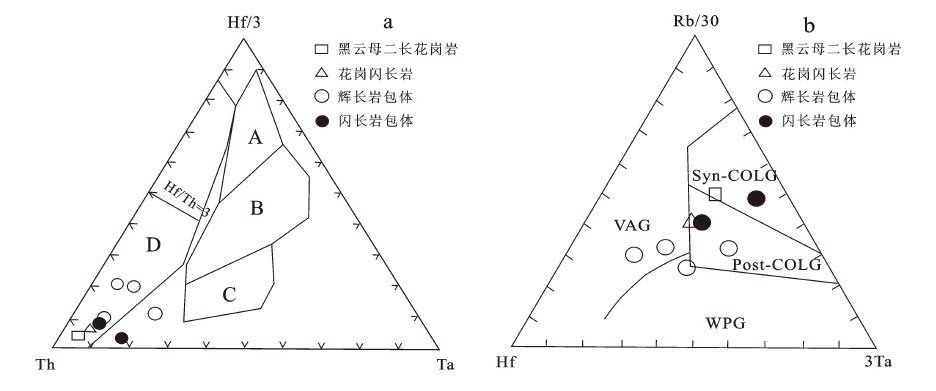 勐养岩体Hf-Th-Ta (a据文献[26])和(Rb/30)-Hf-(Ta×3)(b 据文献[28])判别图解 A—正常洋脊玄武岩;B—富集型洋脊玄武岩;C—板内玄武岩;D—岛弧玄武岩;Syn—COLG—同碰撞花岗岩; WPG—板内花岗岩;VAG—火山弧花岗岩; Post-COLG—后碰撞花岗岩 Fig.9 Diagrams of the tectonic setting of trace elements for Mengyang intrusion (Fig. a after reference [26]; Fig. b after reference [28])A-N-MORB; B-E-MORB; C-Intraplate basalt; D-Island-arc basalt; VAG-Volcanic Arc Granites; Syn-COLG-Syn-Collision Granites; WPGIntraplateGranites; ORG-Ocean Ridge Granites; Post-COLG-Post- Collision Granites |