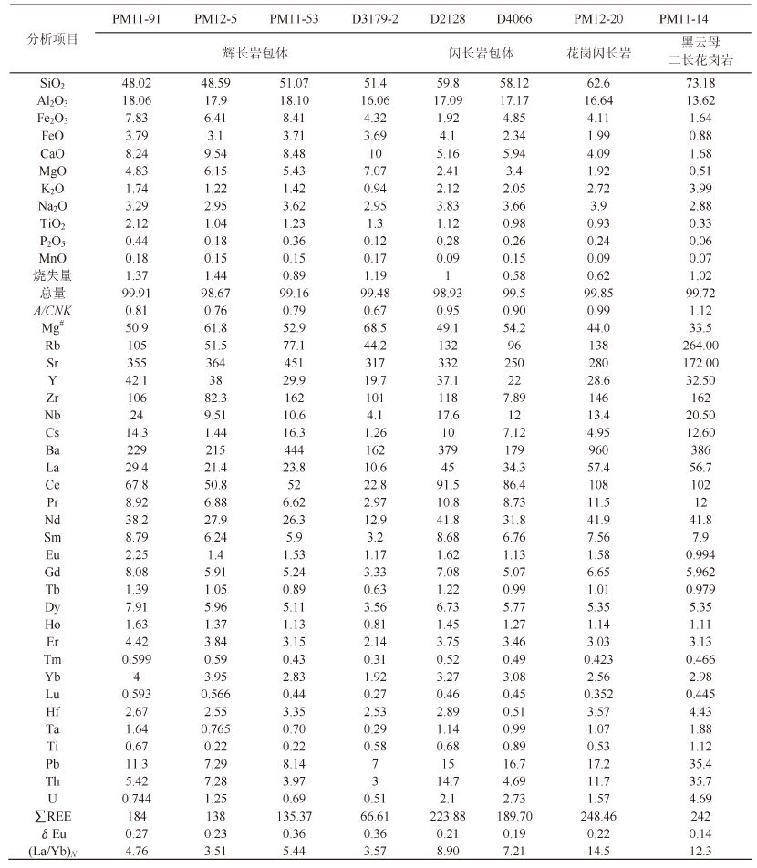 | 表1 勐养二长花岗岩、花岗闪长岩、暗色包体的主量元素(%)和微量元素(10-6)的地球化学分析数据 Table 1 Major(%)and trace elements (10-6 ) compositions of the biotite monzogranite,granodiorite and dark enclaves(123 Ma) in Mengyang granite |