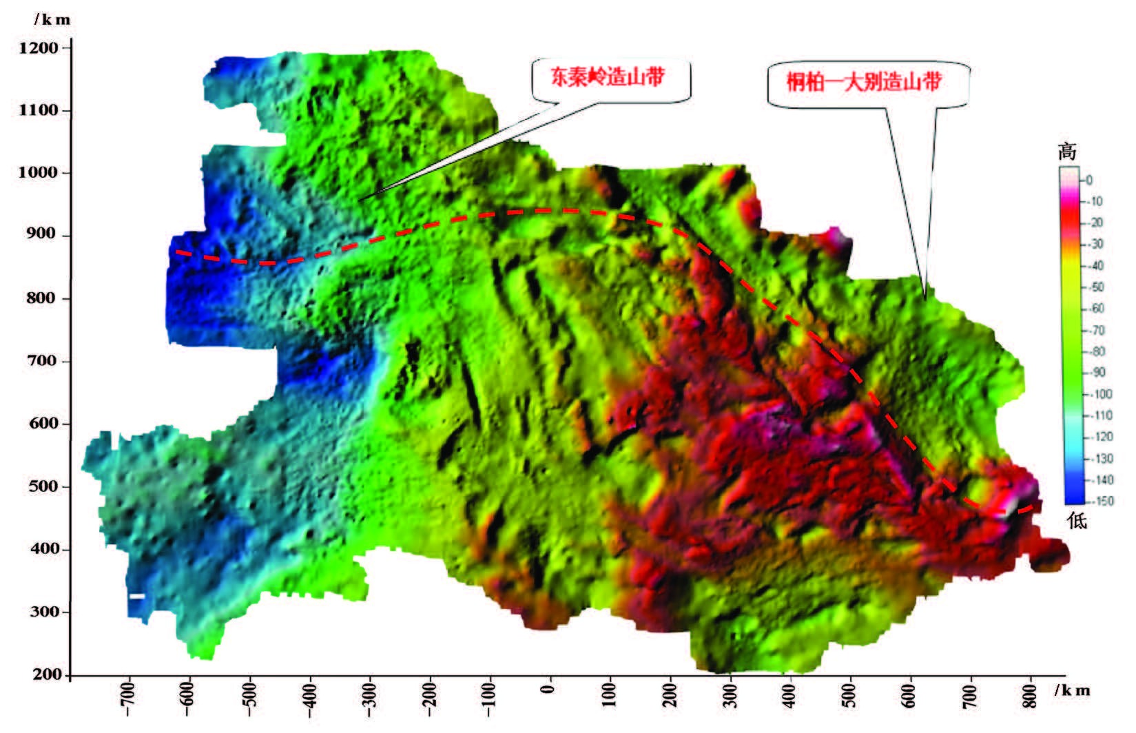 (2)在造山带南缘,正的串珠状剩余重力异常、正的小波细节局部异常、正的强弱不等的磁异常带,皆反映了板块缝合带存在的位置;同时也说明了在板块缝合带内,含有玄武质洋壳及火山岩、基性、超基性岩墙及榴辉岩等高密度高磁性物质。