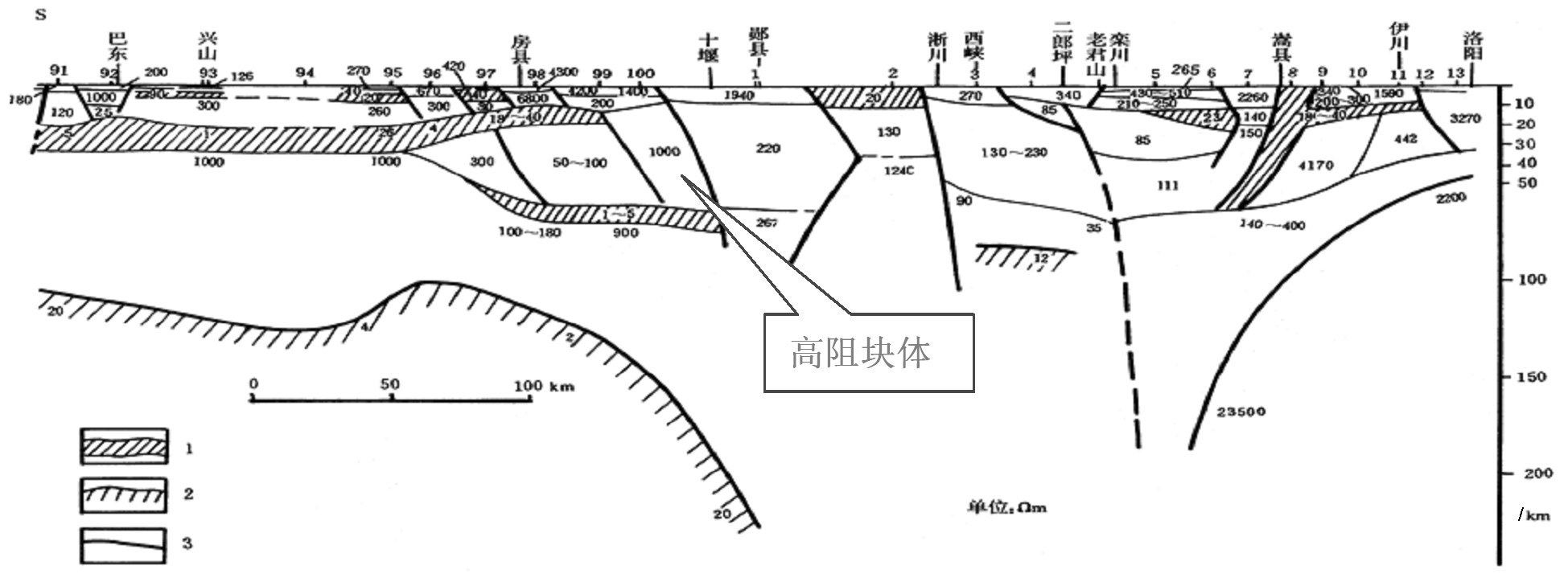 巴东—洛阳大地电磁测深剖面(据文献[28]修改) 1—低阻体;2—岩石圈底界面;3—推测断裂 Fig.10 Badong-Luoyang magnetotelluric sounding profile (modified after reference [28] ) 1-Low resistivity body; 2-Lithospheric bottom interface; 3-Inferred fracture |