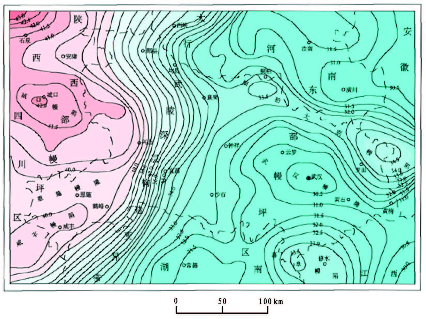 图2 湖北省及周边地区莫霍面等深图 Fig.2 Moho bathymetric map of Hubei Province and surrounding areas |