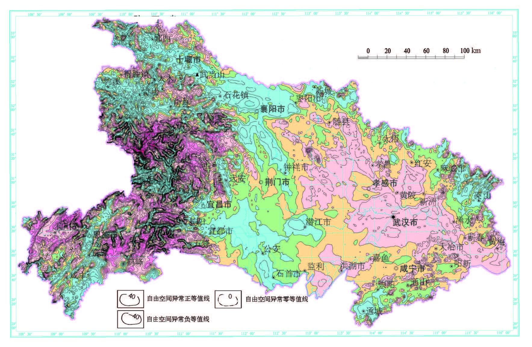 图3 湖北省自由空间重力异常图 Fig.3 Free-space gravity anomaly map of Hubei Province |