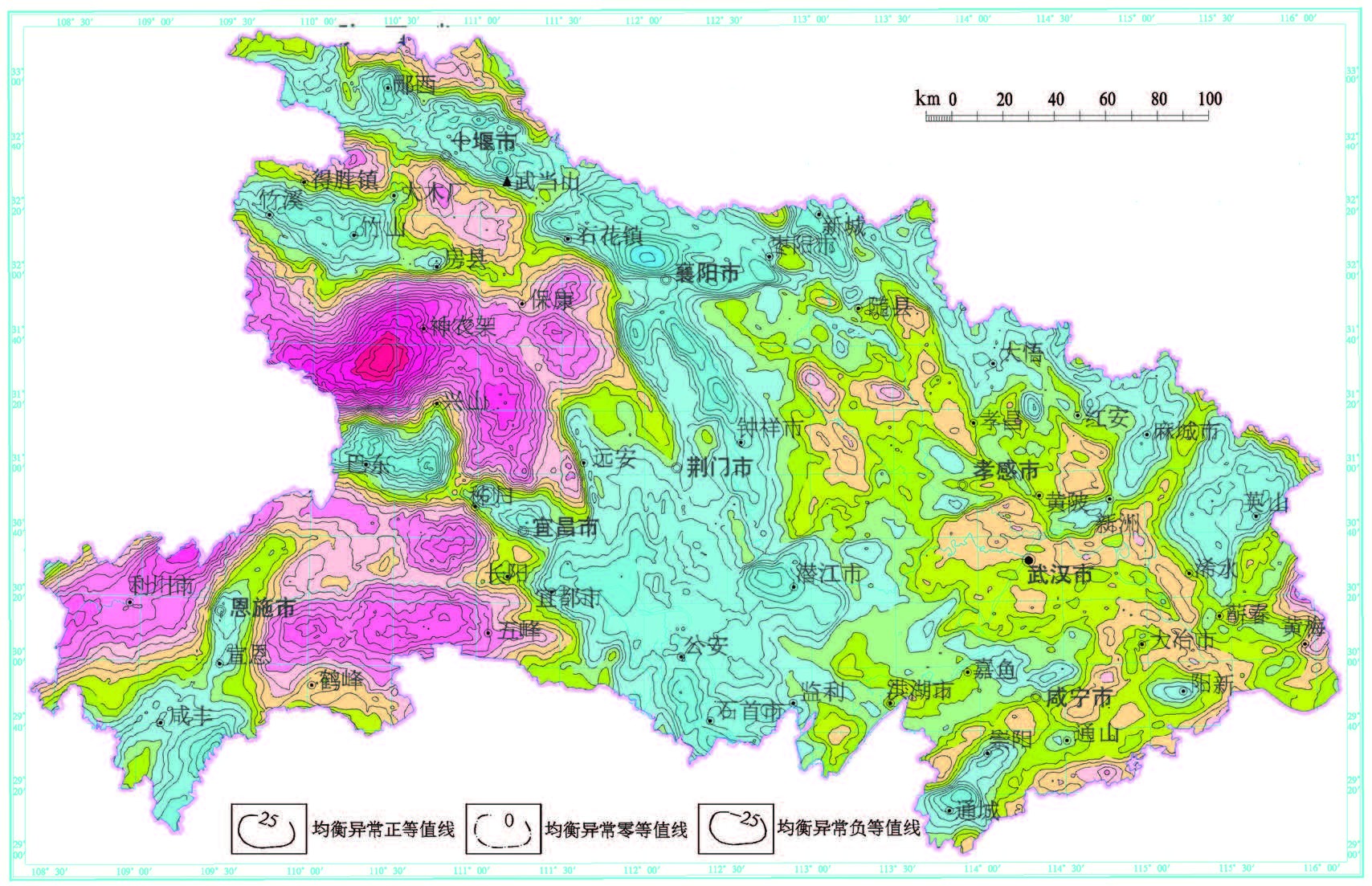 图4 湖北省均衡重力异常图 Fig.4 Isostatic gravity anomaly map of Hubei Province |
