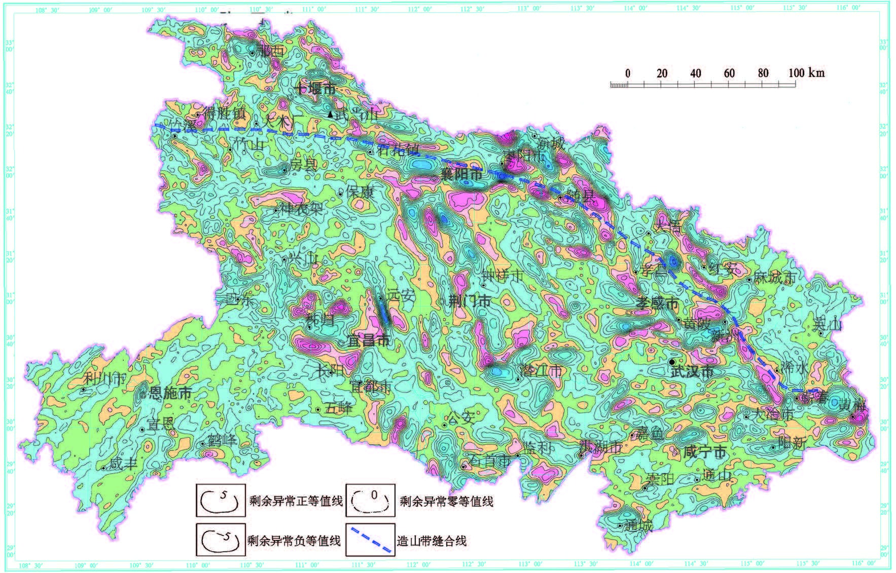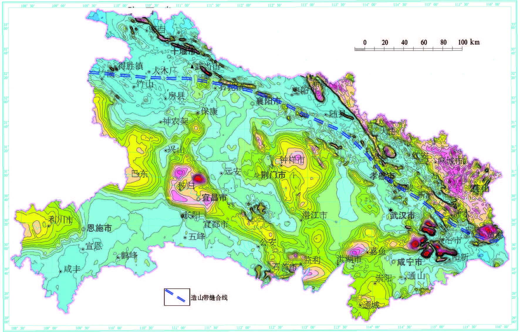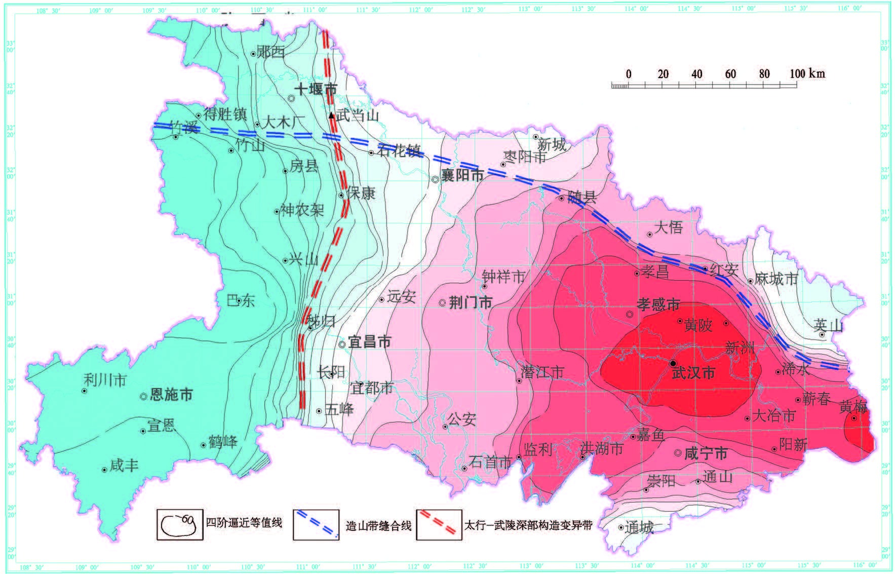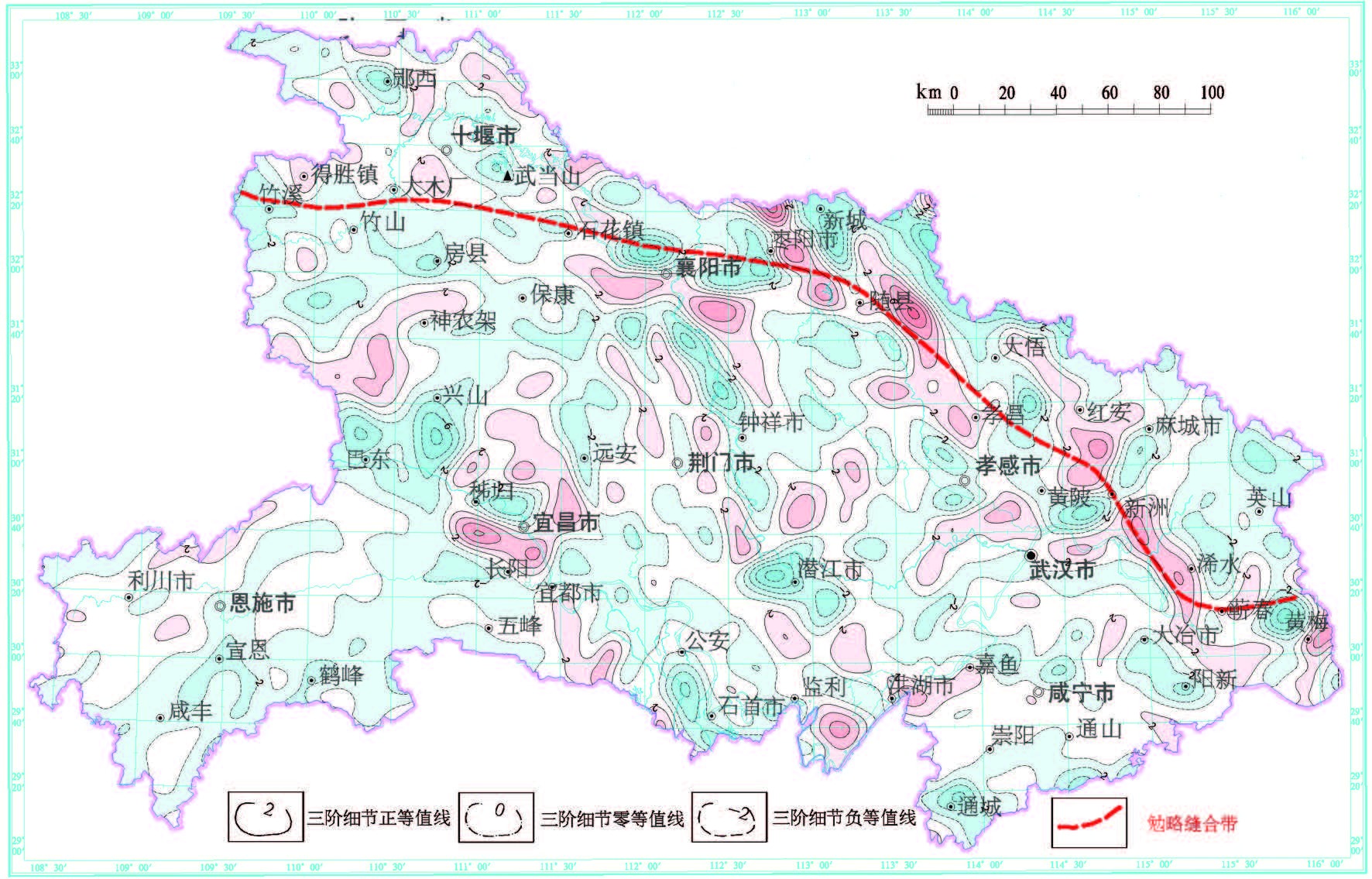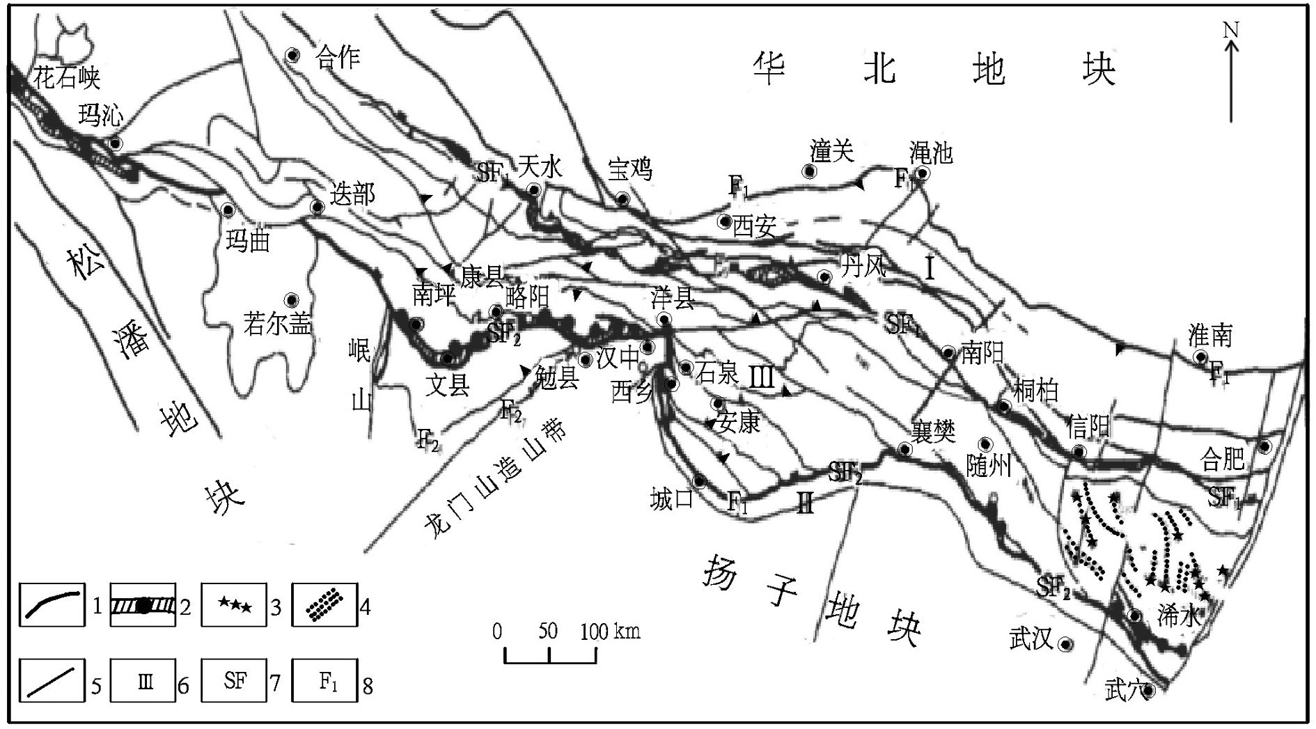 (4)桐柏—大别南缘缝合带位置,从西向东经枣阳—随县—红安—浠水,终于郯庐断裂;东秦岭南缘缝合带位置,从东向西经枣阳—襄樊—石花镇—大木厂—得胜镇,向西至陕西平利—高川与勉县—略阳连接。