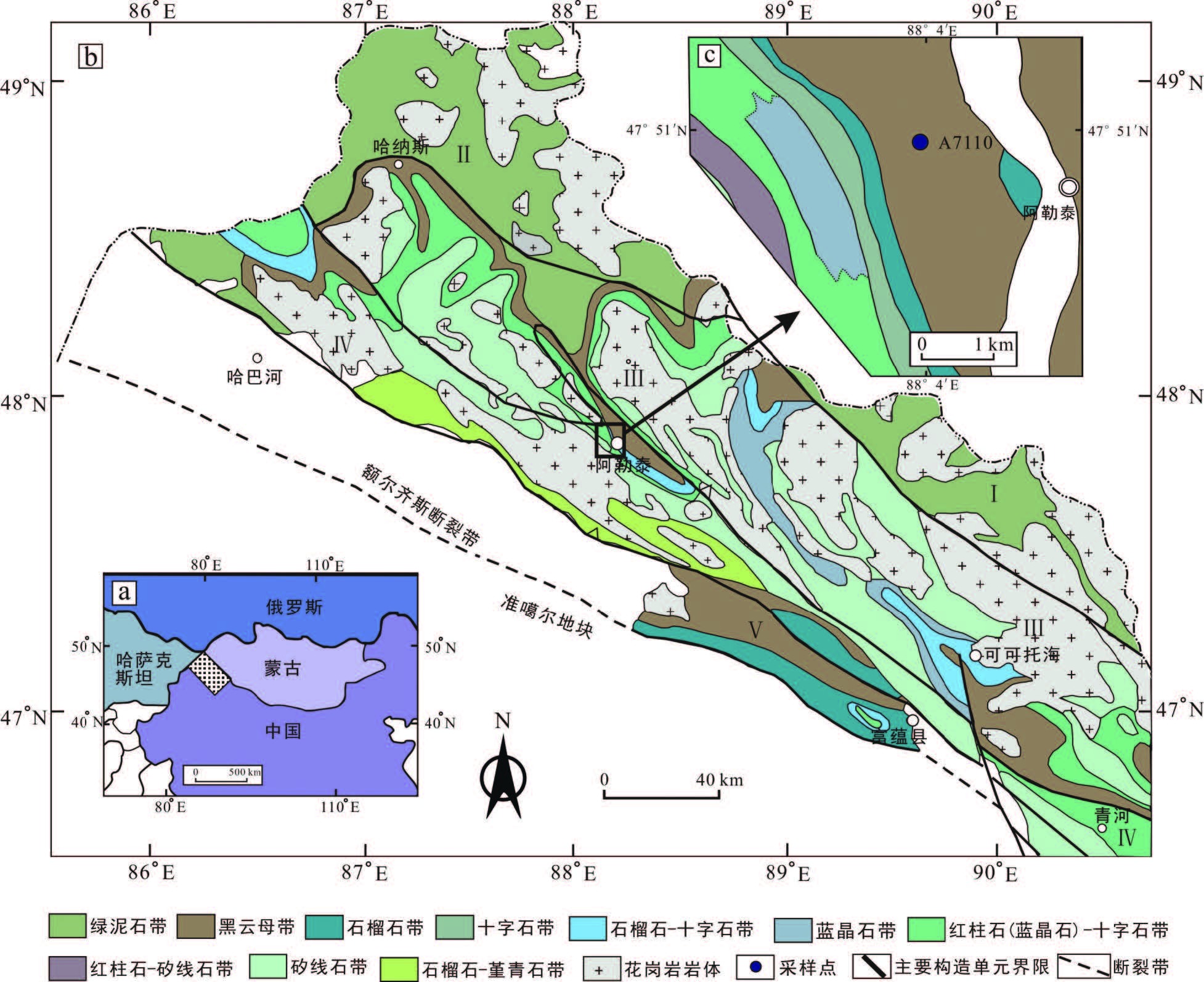 1 区域地质中国阿尔泰造山带是中亚造山带的一部分,呈NW向展布,向西北延至哈萨克斯坦的矿区阿尔泰和俄罗斯的山区阿尔泰,向东南连至蒙古的戈壁阿尔泰(图1-a),北邻西萨彦岭古岛弧带,南侧以额尔齐斯断裂与准噶尔地块相接[1, 2, 14, 16, 24, 25, 26, 27]。阿尔泰造山带于晚前寒武纪处于稳定大陆边缘阶段[16, 24, 25, 28],自寒武纪以来转变为活动陆缘环境[9, 22],并长期处于俯冲环境[1, 2]。根据已有的地质调查该区域一般被分成5 个主要的NW-SE 向延伸的构造单元[14, 17, 25](图1-b):(1)阿尔泰山区块体,中晚泥盆世的火山岩(安山岩和英安岩)以及晚泥盆世到早石炭世的变质沉积岩(页岩、粉砂岩、杂砂岩、砂岩、灰岩)构成了该块体的主体,多数沉积岩已经变质到绿片岩相[17]。(2)西北阿尔泰山块体,主要包括哈巴河群的浊积岩及其上覆的白哈巴群的晚奥陶世火山岩。前人认为哈巴河群形成于震旦—寒武纪[11]或南华—震旦纪[29]或新元古代(震旦纪)到中奥陶世[25];而最近的锆石年代学表明哈巴河群形成的时代下限是470 Ma,上限是384 Ma,即中奥陶世到早泥盆世,且形成于活动大陆边缘构造环境[30]。哈巴河群的岩石已经发生等倾褶皱,具有很陡的轴面,并变质到低绿片岩相。(3) 中阿尔泰山块体,该块体构成了中国西北阿尔泰造山带的中心部分,主要由中奥陶世到早泥盆世的哈巴河群[30](主要是大陆碎屑组成的浊积岩)以及中—晚志留世的库鲁木提群组成。在该块体中的沉积岩已经发生了各种级别的变质,从绿片岩相到高角闪岩相,一般达到较高的变质相。该块体的北部边界为红山嘴断裂。(4)阿巴宫块体,康布铁堡组以及阿勒泰组构成了阿巴宫块体的主体,康布铁堡组主要由晚志留世到早泥盆世的弧火山岩和火山碎屑岩构成,也包括少量基性火山岩和细碧岩[2, 8, 25]。康布铁堡组可能形成于弧背景而非大陆裂谷背景[2, 25] 。阿勒泰组由中泥盆世的变质岩构成,从绿片岩相到高角闪岩相的变质带在该地块出露,局部地区达到了麻粒岩相[31]。(5)额尔齐斯块体,北部边界为科沙哈拉尔断裂,在南部,额尔齐斯断裂将额尔齐斯地块与准噶尔板块分开。该块体自西往东变窄,在其东部宽度只有10 km 左右,其西部被第四纪沉积物覆盖,主要由早古生代到泥盆纪的沉积岩及石炭纪火山碎屑岩组成,它们已经变质到绿片岩到角闪岩相。高级片麻岩在局部地区出露,之前被认为是前寒武纪的基底[32],而新的锆石年代学研究表明其可能形成于石炭纪[33]。阿尔泰造山带发育有蓝晶石型和红柱石型两种不同压力类型的变质带。蓝晶石型变质带从低向高出现黑云母带、石榴石带、十字石带、十字石-蓝晶石带、矽线石带;红柱石型变质带出现黑云母带、石榴石带、十字石带、十字石-红柱石带、矽线石带以及局部石榴石-堇青石带[17, 31, 34, 35]。