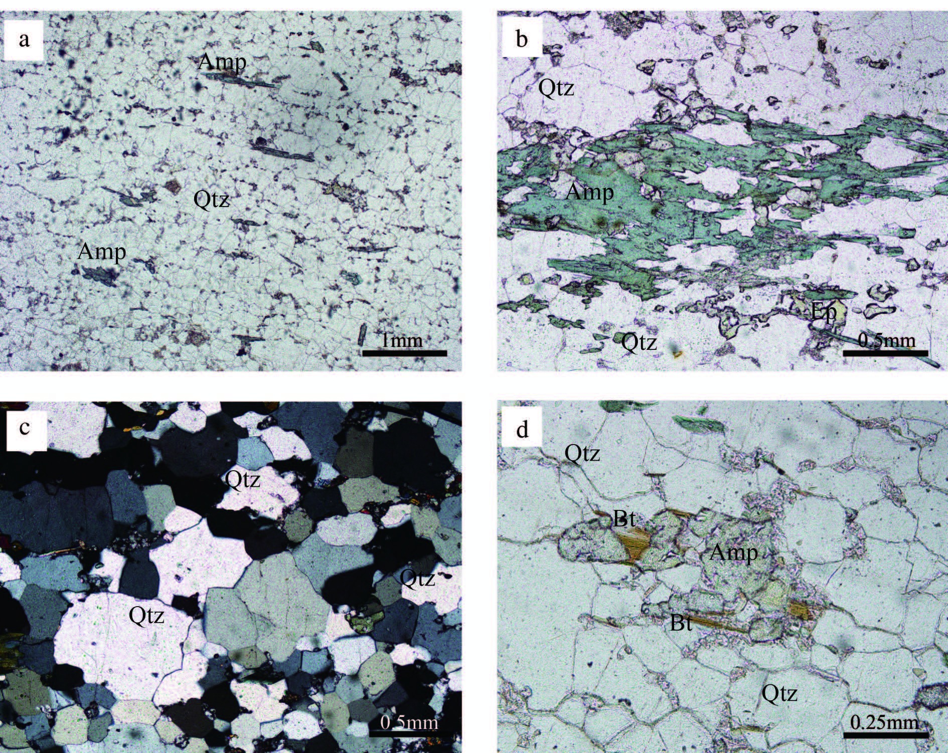 石英岩岩相显微图片 Qtz—石英; Bt—黑云母; Amp—角闪石; Ep—绿帘石; a、b、d—单偏光; c—正交光 Fig.2 Petrographic microphotos of the quartzite Qtz-Quartz; Bt-Biotite ; Amp-Amphibole ; Ep-Epidote; a,b,d-Under plainlight; c-Under crossed nicols |