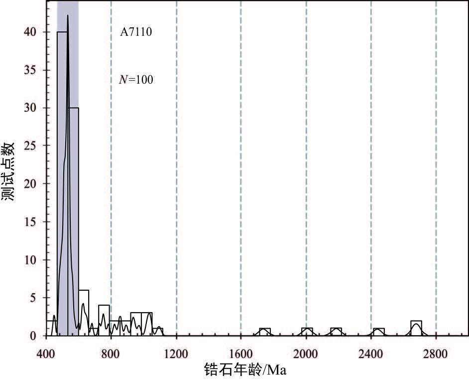 样品A7110 的碎屑锆石表面年龄分布范围为(443±5) Ma至(2682±19) Ma(图5),主要集中于寒武纪(486~540 Ma),多达56%,其中年龄峰值出现在527~535 Ma;该组锆石绝大多数发育清晰的震荡环带,且Th/U比值大于0.1,具有明显的岩浆成因特征,少部分锆石呈浑圆状,无清晰的震荡环带,但Th/U比值仍较高(>0.1) (表1,图3-x~y)。样品中具有新元古代年龄(542~971 Ma)的锆石较多,达28%,并在544~553 Ma和620~629 Ma 年龄段上较集中。该样品最年轻碎屑锆石形成于晚奥陶世((443±5) Ma 与(451 ± 5) Ma);还有较少锆石具有中元古代年龄(1020~1094 Ma)和古元古代年龄(1731~2460 Ma)。两颗碎屑锆石显示谐和的太古宙年龄(206Pb/207Pb年龄(2675±19)Ma,Th/U=0.768,Disc=-4;206Pb/207Pb年龄(2682±19)Ma,Th/U=0.651,Disc=1)。
