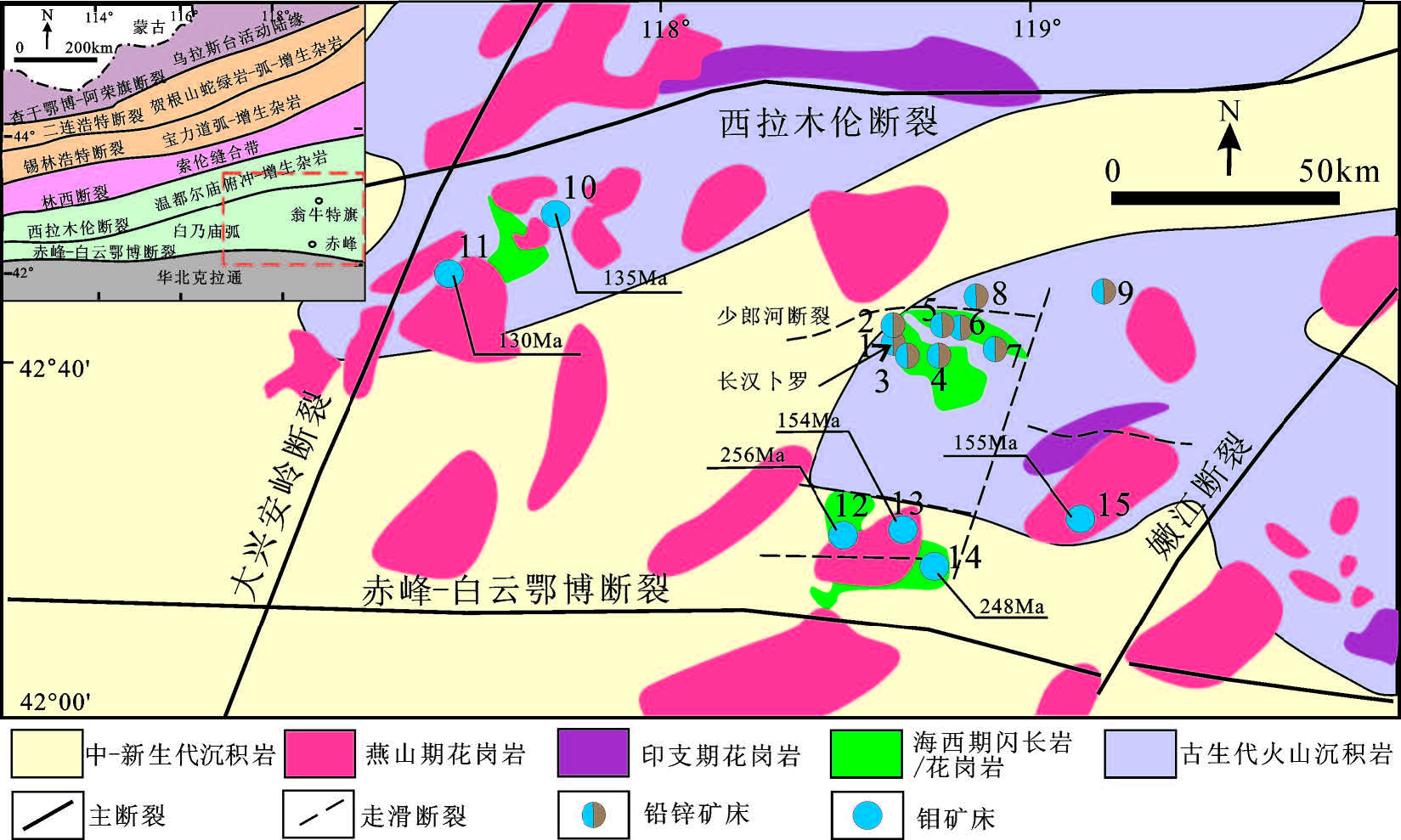 图1 华北克拉通北缘地质简图及钼、铅锌矿床分布(底图据文献[11]; 图中矿床年龄值引自文献[15, 17, 18, 20] ) 矿床编号: 1—长汉卜罗; 2—硐子; 3—炮手营子; 4—山嘴子; 5—田椿沟; 6—西水泉; 7—小营子; 8—余家窝铺; 9—敖包山; 10—小东沟;11—红山子; 12—车户沟; 13—碾子沟; 14—元宝山; 15—鸡冠山 Fig.1 Geological sketch map of the northern margin of North China Craton,showing the location of major Mo and Pb-Zn deposits (after reference [11]. The ages of the deposits cited from references [15, 17, 18, 20]) Serial number of the deposit: 1-Changhanboluo; 2-Huanggutun; 3-Paoshouyingzi; 4-Shanzuizi; 5-Tianchungou; 6-Xishuiquan; 7-Xiaoyingzi;8-Yujiawopu; 9-Aobaoshan; 10-Xiaodonggou; 11-Hongshanzi; 12-Chehugou; 13-Nianzigou; 14-Yuanbaoshan; 15-Jiguanshan |