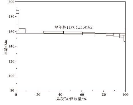 4 年代学研究长汉卜罗矿床用于绢云母Ar-Ar 定年的样品采自近矿的蚀变围岩,样品发生了较为强烈的绢云母化蚀变。该样品的绢云母Ar-Ar 同位素分析结果列于表2。该样品从800℃至940℃的5 个连续加热阶段析出,形成较好的坪年龄,年龄值为(157.6±1.4) Ma (MSWD=1.01) (图10)。