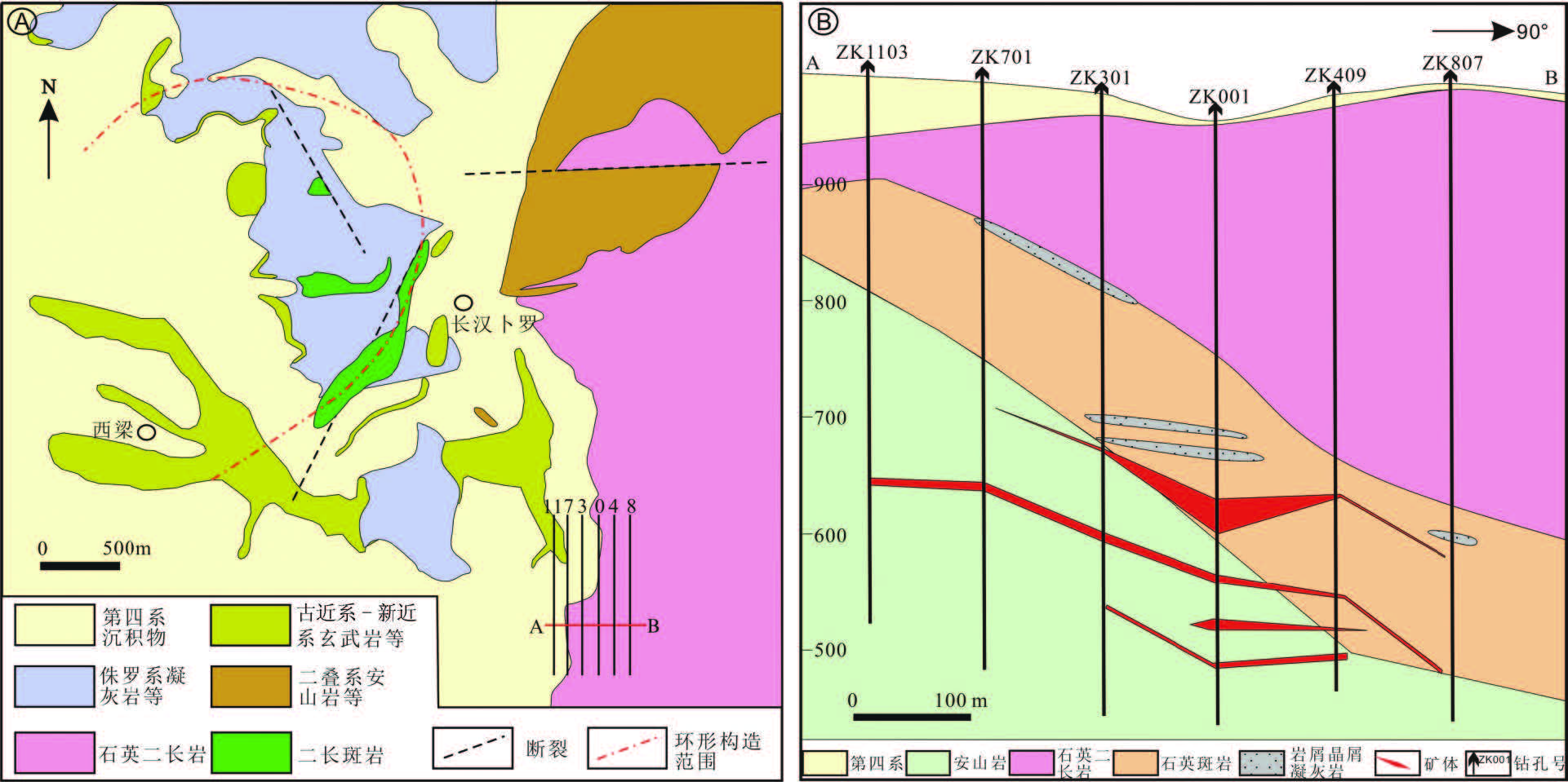 图2 长汉卜罗铅锌银矿区地质图(A)及剖面图(B) Fig.2 Geological map (A) and geological section (B) of the Changhanboluo Pb-Zn-Ag ore field |