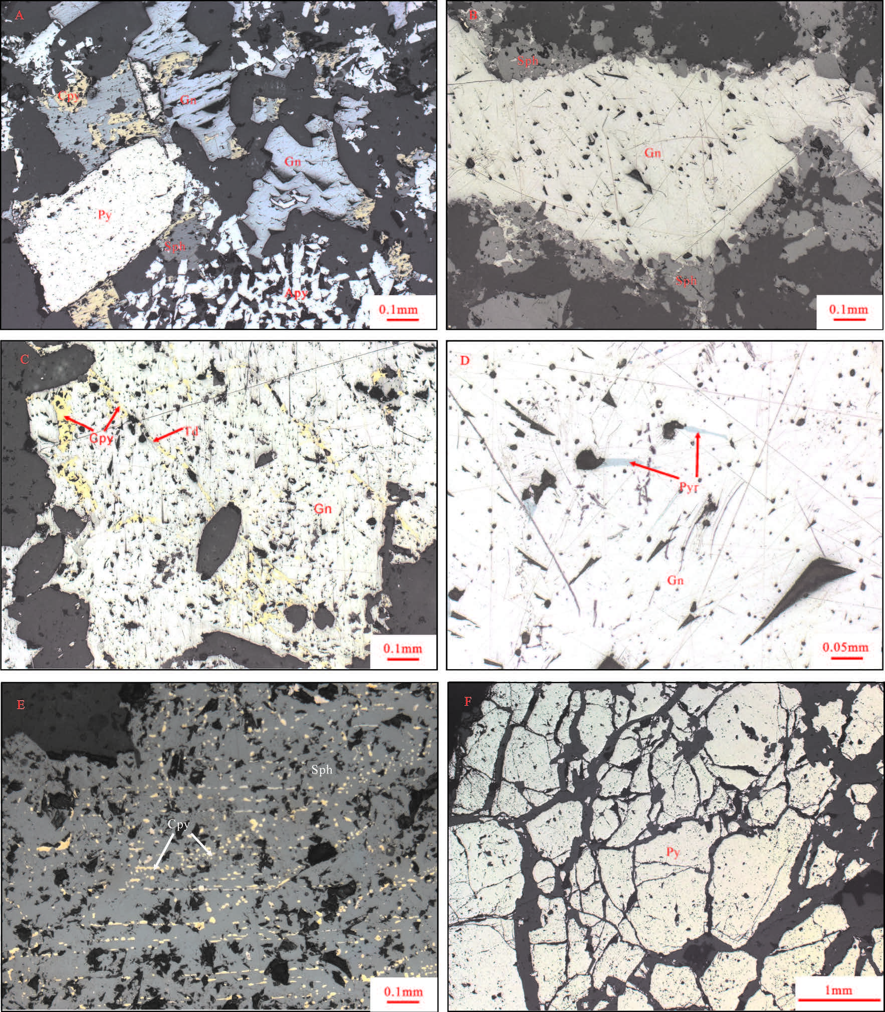 图3 长汉卜罗铅锌银矿床矿石特征 A—黄铁矿、毒砂等呈自形-半自形粒状结构,在方铅矿中可见包含毒砂的包含结构,黄铁矿边部被闪锌矿交代;B—方铅矿边部被闪锌矿交代呈交代港湾状结构; C—方铅矿被黄铜矿、黝铜矿交代呈交代网脉结构; D—深红银矿交代方铅矿;E—黄铜矿呈乳滴状分布于闪锌矿中; F—黄铁矿压碎结构 矿物缩写: Apy—毒砂; Cpy—黄铜矿; Gn—方铅矿; Py—黄铁矿; Pyr—深红银矿; Sph—闪锌矿; Td—黝铜矿 Fig.3 Photographs showing ore characteristics of the Changhanboluo Pb-Zn-Ag deposit A-Pyrite and arsenopyrite with euhedral-subeuhedral granular texture; arsenopyrite included in galena; pyrite replaced by sphalerite;B-Galena replaced by sphalerite; C-Galena replaced by chalcopyrite and tetrahedrite; D-Galena replaced by pyrargyrite;E-Sphalerite containing chalcopyrite droplets,forming exsolution texture; F-Pyrite with cataclastic texture Abbreviations: Apy-Arsenopyrite; Cpy-Chalcopyrite; Gn-Galena; Py-Pyrite; Pyr-Pyrargyrite; Sph-Sphalerite; Td-Tetrahedrite |