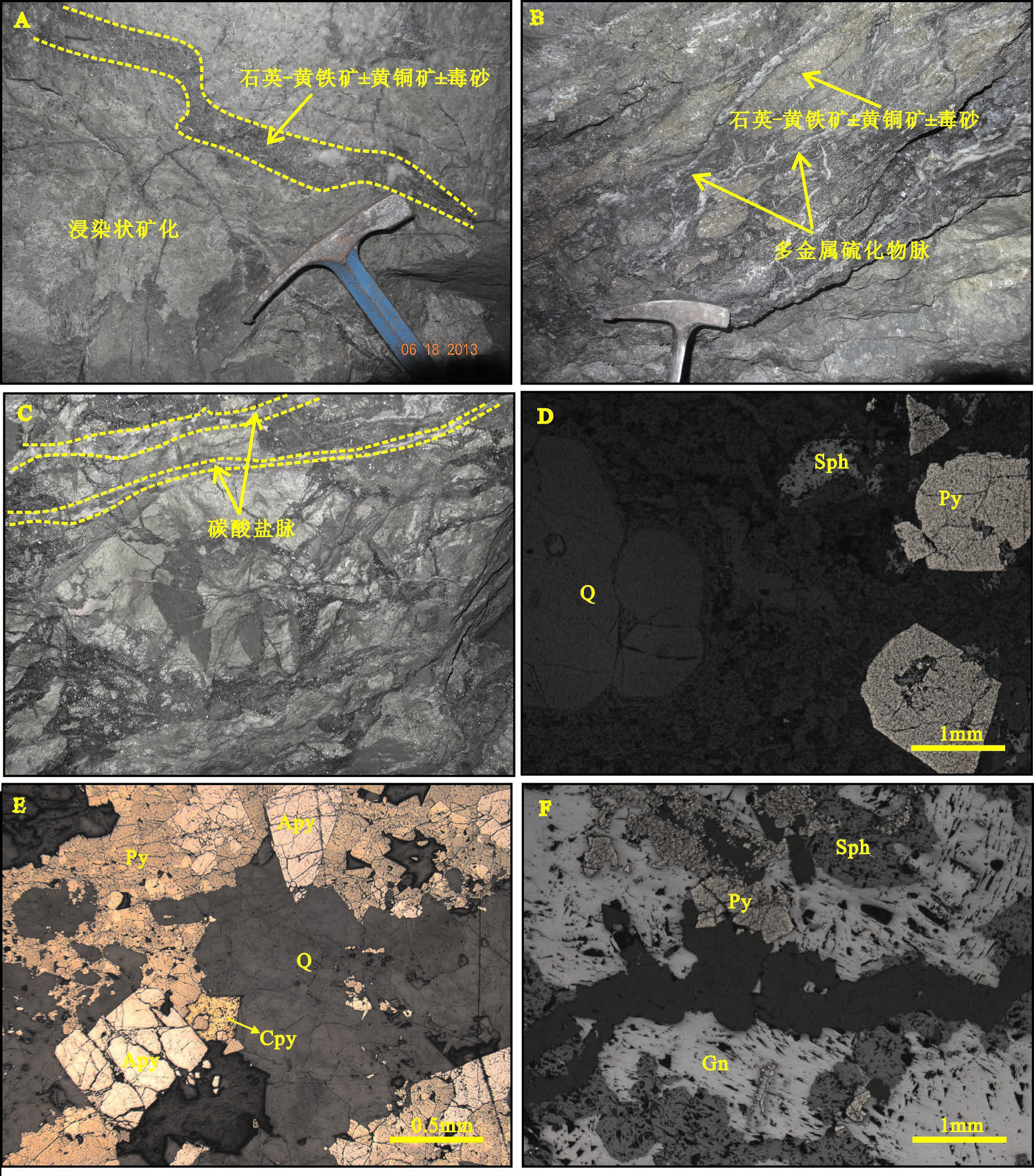 根据矿脉穿插关系及矿物组合等,将成矿过程划分为早、中、晚3 个成矿阶段(图4)。早阶段为浸染状矿化,金属矿物组合主要为黄铁矿、闪锌矿,并有少量方铅矿(图4-A,D)。中阶段为多金属硫化物脉,该阶段又可细分为2 个亚阶段: ①石英-黄铁矿± 黄铜矿±毒砂亚阶段(Ⅰ),可见石英-黄铁矿±黄铜矿±毒砂脉穿插早阶段浸染状矿化体(图4-A),矿物组合主要为石英、黄铁矿、黄铜矿、毒砂,并有少量绢云母,黄铁矿、毒砂等呈较自形粒状分布于石英内(图4-A,E); ②石英-铅锌多金属硫化物亚阶段(Ⅱ),以多金属硫化物的大量产出为特征,是主要的铅锌银成矿阶段,可见石英-多金属硫化物脉穿插石英-黄铁矿±黄铜矿±毒砂脉(图4-B,F),矿物组合为石英、方铅矿、闪锌矿、黄铁矿、毒砂、黄铜矿、深红银矿、白铁矿等。晚阶段为石英-碳酸盐脉,以发育石英-方解石-黄铁矿或方解石细脉为特征,可见石英-碳酸盐脉切割早期矿脉(图4-C)。