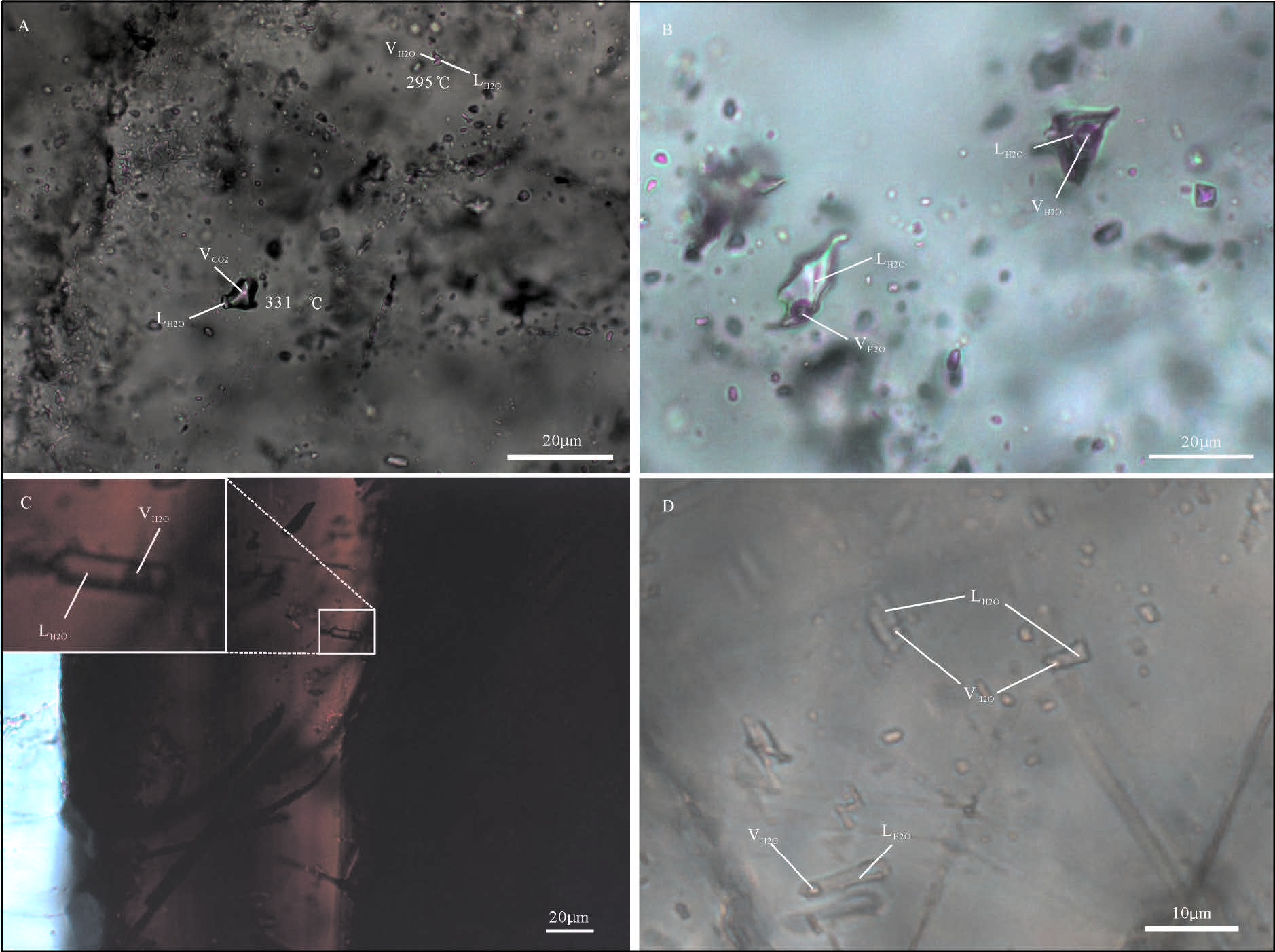 图5 长汉卜罗矿床流体包裹体岩相学特征 A—早阶段W型和C型包裹体共存; B—中阶段石英中W型包裹体; C—中阶段闪锌矿中W型包裹体; D—晚阶段方解石中W型包裹体 Fig.5 Photomicrographs of fluid inclusions in the Changhanboluo deposit A-Coexistence of W-type and C-type fluid inclusions of the early stage; B-W-type fluid inclusions of the middle stage; C-W-type fluid inclusions in sphalerite of the middle stage; D-W-type fluid inclusions in calcite of the late stage |