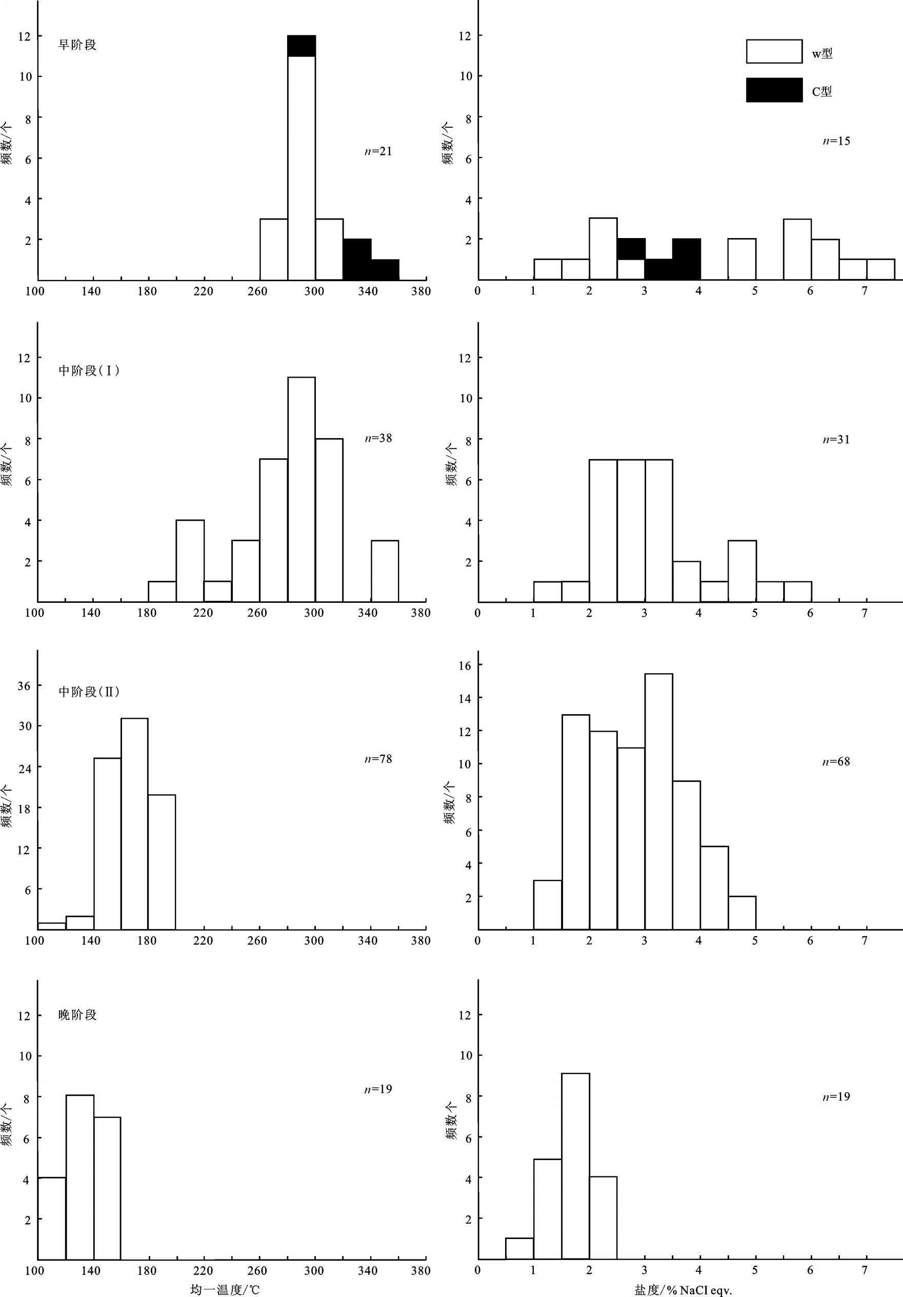 图6 长汉卜罗矿床流体包裹体均一温度和盐度直方图 Fig.6 Histograms of salinities and homogenization temperatures of fluid inclusions in different stage minerals of the Changhanboluo deposit |