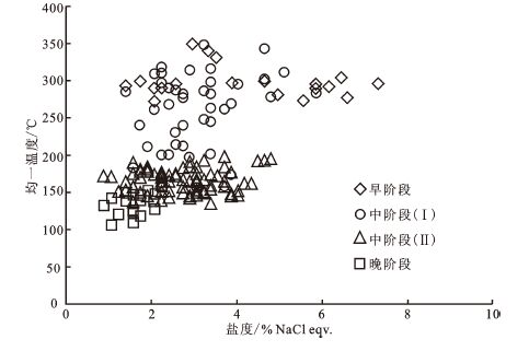 图7 长汉卜罗矿床流体包裹体温度-盐度相关图 Fig.7 Homogenization temperatures versus salinities of fluid inclusions in different stages of the Changhanboluo deposit |