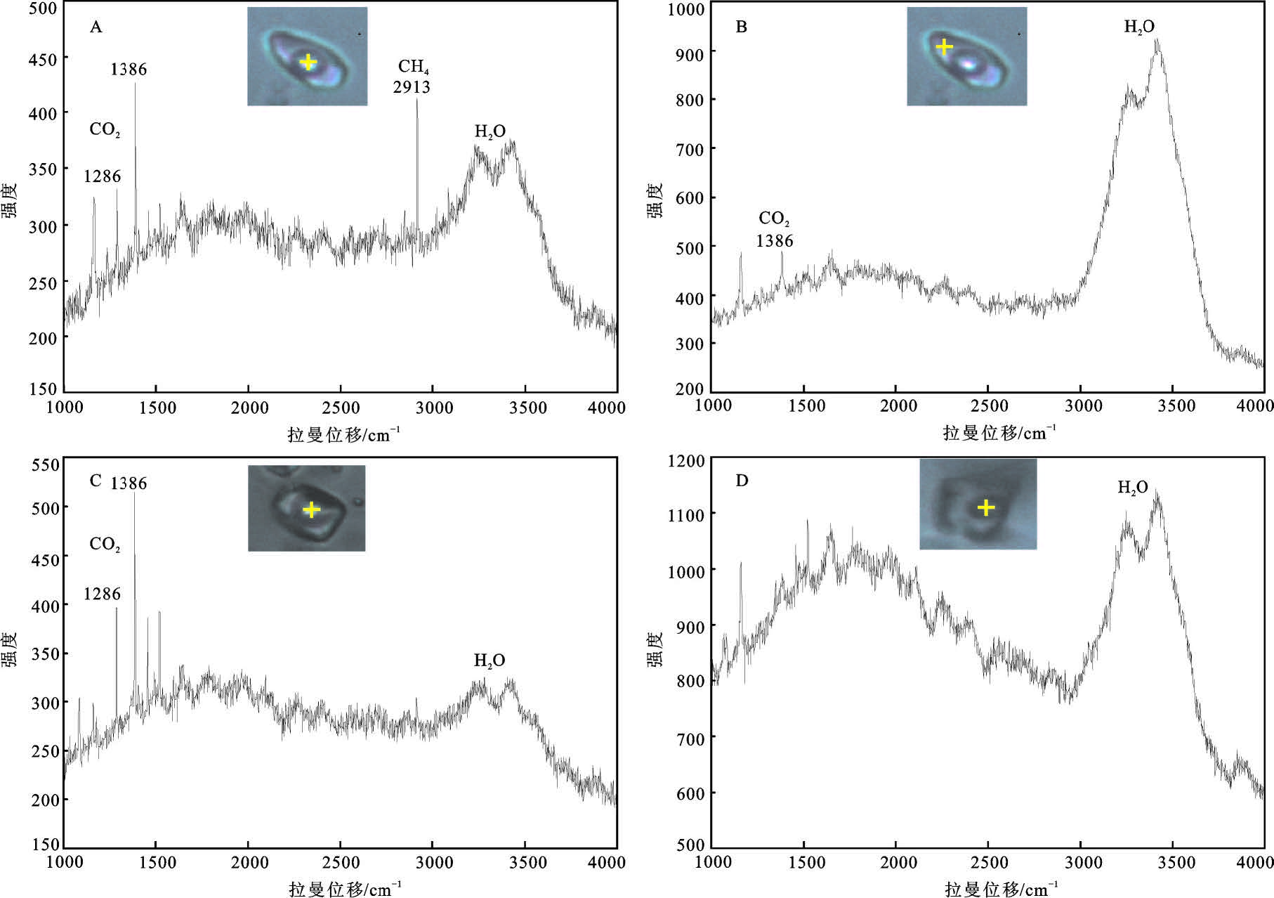 早阶段石英斑晶中流体包裹体气相成分为CO2+CH4±H2O,液相成分中除了H2O之外,也含有少量CO2; 中阶段(Ⅰ),气相成分为CO2、H2O; 中阶段(Ⅱ),气相主要为H2O。CO2特征峰值为1286 cm-1、1386 cm-1,CH4特征峰值为2913 cm-1。可见从早阶段到晚阶段,流体系统的成分组成变的简单,CH4、CO2等气体逐渐逸失。