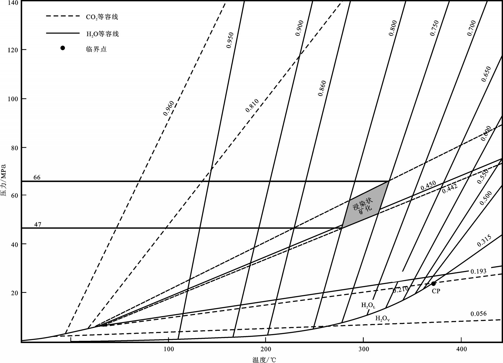 3.5 成矿流体压力及深度估算Roedder & Bodnar 研究认为[22],从均匀流体中捕获的包裹体的压力只能代表流体压力的下限,需要进行压力校正,但是当流体发生不混溶或沸腾作用时,捕获的包裹体的压力可代表流体的形成压力,无需校正。浸染状矿化阶段发育近纯CO2包裹体和低盐度(<5%NaCl eqv.)的水溶液包裹体,它们可分别代表近似纯CO2 体系和纯H2O 体系,据纯CO2包裹体的均一温度和均一相态,利用FLINCOR 软件求得4 个包裹体中纯CO2 的密度介于0.442~0.523 g/cm3。根据H2O-CO2体系的P-T 图解(图9), 获得浸染状矿化阶段流体的捕获温度为277℃~ 327℃,捕获压力为47~66 MPa。该阶段大致可用静岩压力(岩石密度为2.65 g/cm3)来估算成矿深度,对应的古深度为1.8 ~2.5 km。