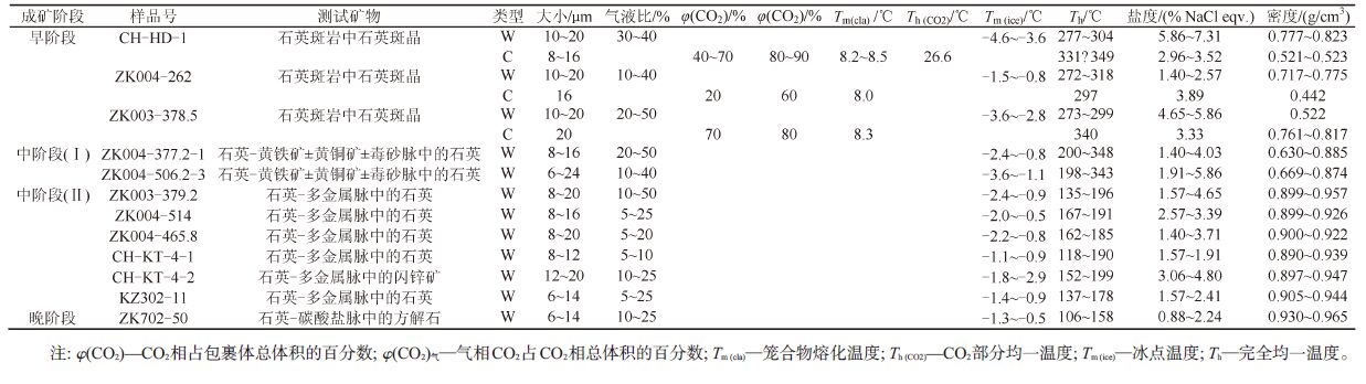 流体包裹体测试所选样品主要来自钻孔ZK003、ZK004、KZ302、ZK702 等,其中早阶段主要为浸染状矿化,样品选自矿化的石英斑岩,中阶段(Ⅰ)选自穿插浸染状矿化石英斑岩的石英-黄铁矿± 毒砂±黄铜矿脉,中阶段(Ⅱ)选自穿插石英-黄铁矿± 黄铜矿±毒砂脉的石英-多金属硫化物脉,晚阶段样品选自石英-碳酸盐脉。