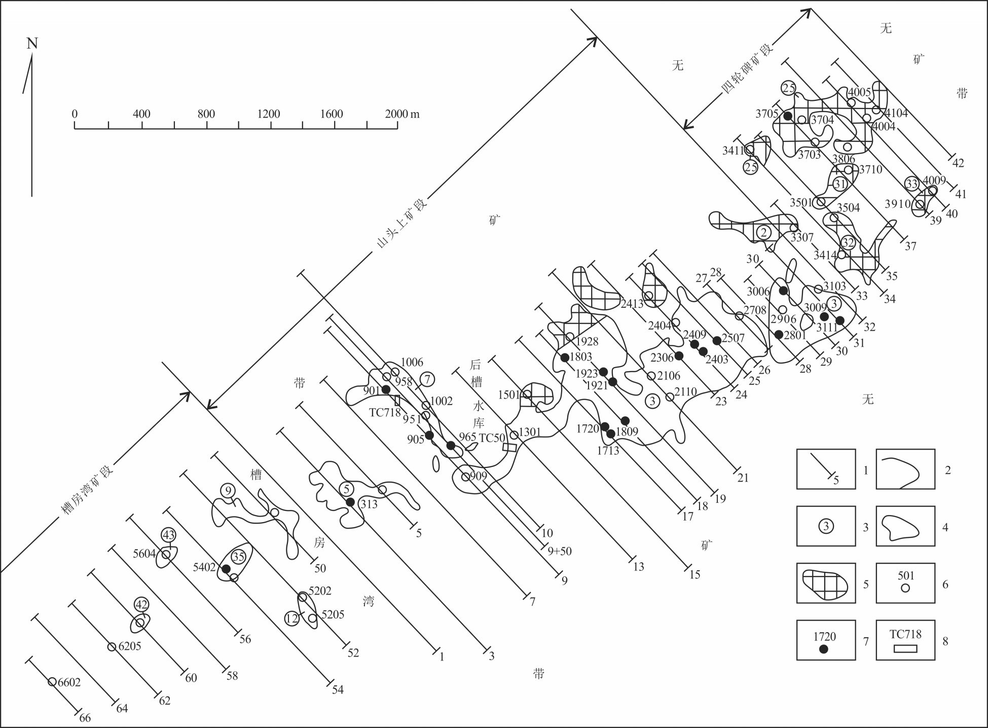 遵义后槽铝土矿区主要铝土矿体平面分布图(据文献[3]、[4]中有关资料编绘) 1—勘查线及编号; 2—矿体边界线; 3—主要矿体编号; 4—低铁铝土矿体; 5 —高铁铝土矿体; 6—见矿钻孔及编号(大多数钻孔已省略); 7—见炭质岩钻孔及编号; 8—探槽及编号 Fig.1 Distribution of main bauxite orebodies in the Houcao mining area in Zunyi(modified after references [3, 4]) 1-Exploration line and its serial number; 2-Orebody boundary; 3-Serial number of main bauxite orebody; 4-Low-iron bauxite orebody; 5-High-iron bauxite orebody; 6-Ore-intersecting drill hole and its serial number (most drill holes omitted); 7-Carbonaceous rock-intersecting drill hole and its serial number; 8-Trench and its serial number |