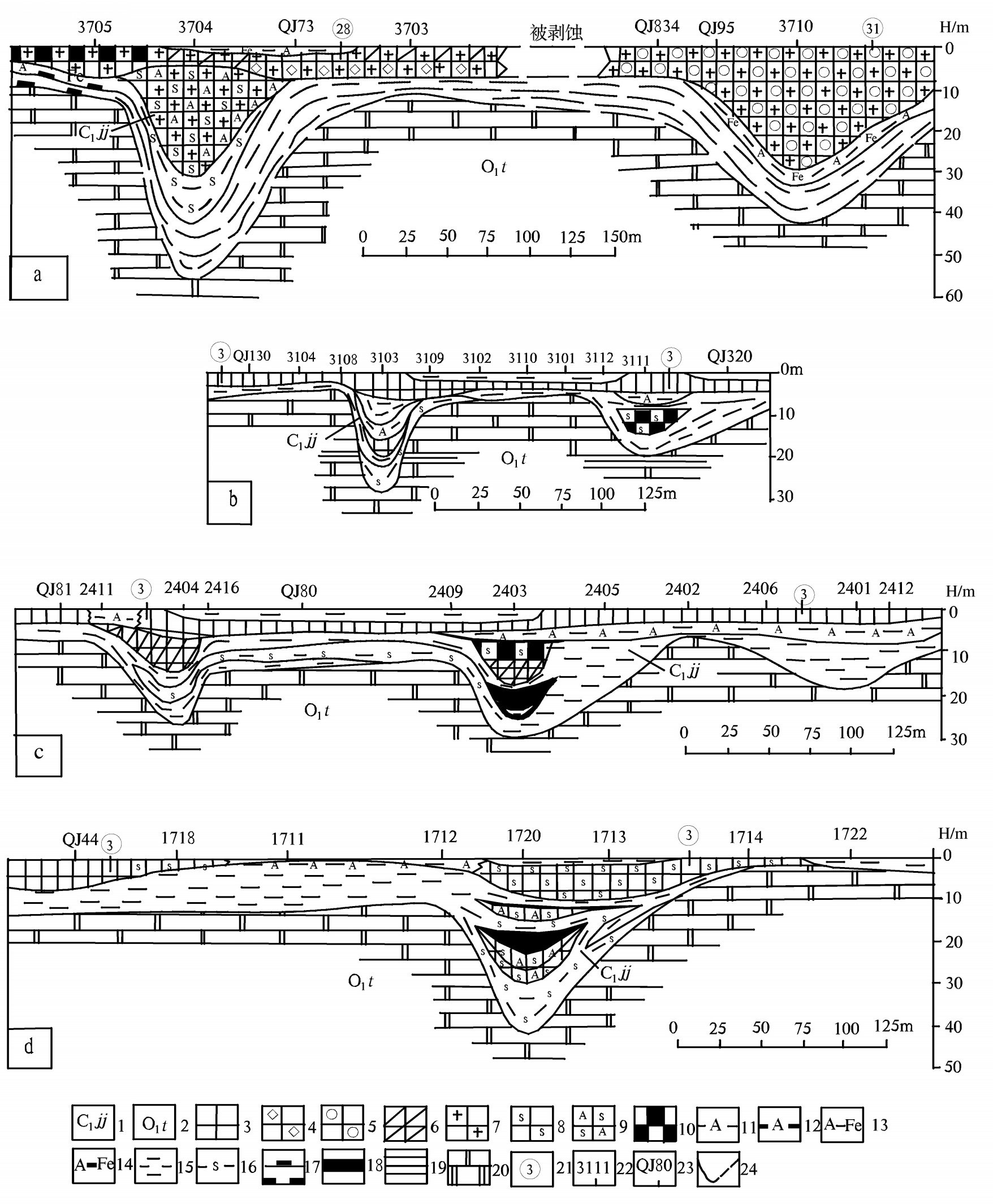 后槽矿区37(a)、31(b)、24(c)、17(d)勘查线九架炉组沉积剖面图(据文献[3]中有关资料综合编制) 1—九架炉组; 2—桐梓组; 3—半土状低铁低硫铝土矿; 4—碎屑状铝土矿; 5 —豆砾状铝土矿; 6—致密状铝土矿; 7—高铁铝土矿; 8—高硫铝土 矿; 9—硫铝矿; 10—高炭铝土矿; 11—铝土质黏土岩(铝土岩); 12—炭质铝土岩; 13—铝铁岩; 14—炭质铝铁岩; 15—黏土岩; 16—硫铁矿层; 17—炭质黏土岩; 18—煤; 19—页岩; 20—白云岩; 21—矿体编号; 22—钻孔及编号; 23—浅井及编号; 24—实测、推测九架炉组底板界线 Fig.2 Sedimentary profile of Jiujialu Formation along exploration line 37(a),31(b),24(c),17(d) in the Houcao mining area (modified after references[3]) 1-Jiujialu Formation; 2-Tongzi Formation; 3-Low-sulfur low-iron semi-earthy bauxite; 4-Clastic bauxite; 5-Pisolitic bauxite; 6-Dense bauxite; 7-High-iron bauxite; 8-High-sulfur bauxite; 9-S-Al ores; 10-High-carbon bauxite; 11-Bauxitic clay rock (bauxitic rock); 12-Carbonaceous bauxitic rock; 13-Aluminiferous; 14-Carbonaceous aluminiferous; 15-Clay rock; 16-Pyrite ore bed; 17-Carbonaceous clay rock; 18-Coal; 19-Shale; 20-Dolomite; 21-Serial number of bauxite orebody; 22-Drill hole and its serial number; 23-Shallow |