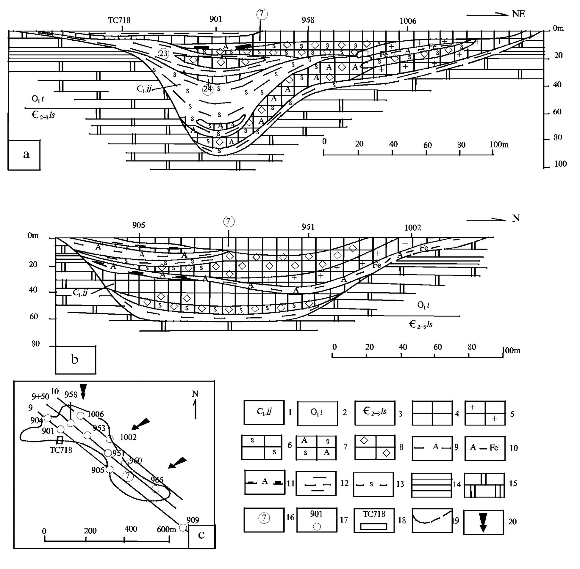图3-c 为9、9+50 和10 勘探线NW段平面图,图中9、9+50、10 线之间的间距皆为50 m,但其中部分钻孔,如ZK960~ZK965 与9 线的线间距为60 m。笔者选编了TC718—ZK901—ZK958—ZK1006(图3-a)和ZK905—ZK951—ZK1002(图3-b)2 个九架炉组横向沉积剖面图。