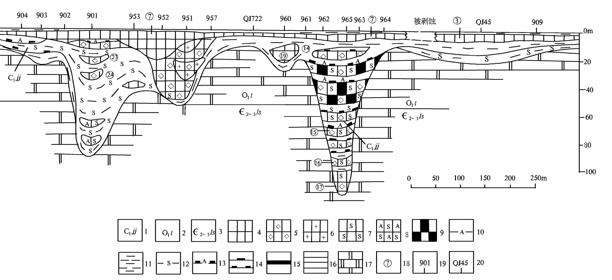 (据文献[3]中有关资料编制; 本图平面位置见图3-c(9-10 线平面图)) 1—九架炉组; 2—桐梓组; 3—娄山关群; 4—半土状低铁低硫铝土矿; 5—碎屑状铝土矿; 6—高铁铝土矿; 7—高硫铝土矿; 8—硫铝矿; 9—高炭 铝土矿; 10—铝土岩; 11—黏土岩; 12—黄铁矿黏土岩、铝土岩(硫铁矿层); 13—炭质铝土岩; 14—炭质黏土岩15—煤; 16—页岩; 17—白云岩; 18—铝土矿体编号; 19—钻孔位置及编号; 20—浅井位置及编号 Fig.4 Sedimentary lengthwise section of Jiujialu Formation along exploration line 9-9+50 (karst ditches) in the Houcao mining area 1-Jiujialu Formation; 2-Tongzi Formation; 3-Loushanguan Group; 4-Low-sulfur low-iron semi-earthy bauxite; 5-Clastic bauxite; 6-High-iron bauxite; 7-High-sulfur bauxite; 8-S-Al ores; 9-High-carbon bauxite; 10-Bauxitic rock; 11-Clay rock; 12-Clay rock and bauxitic rock containing pyrite (pyrite ore beds); 13-Carbonaceous bauxitic rock; 14-Carbonaceous clay rock; 15-Coal; 16-Shale; 17-Dolomite; 18-Serial number of bauxite orebody; 19-Drill hole and its serial number; 20-Shallow bored well and its serial number |