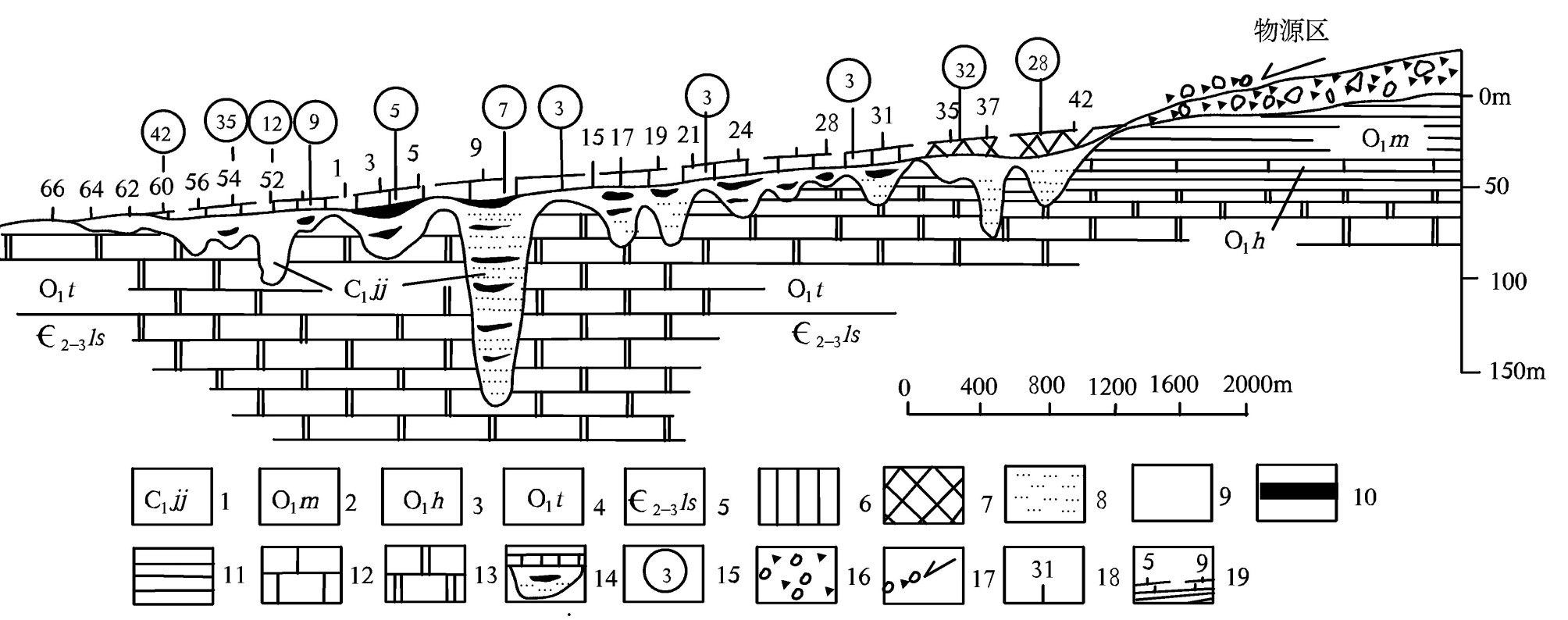 后槽矿区9—9+50勘查线(溶沟)九架炉组纵向沉积剖面图