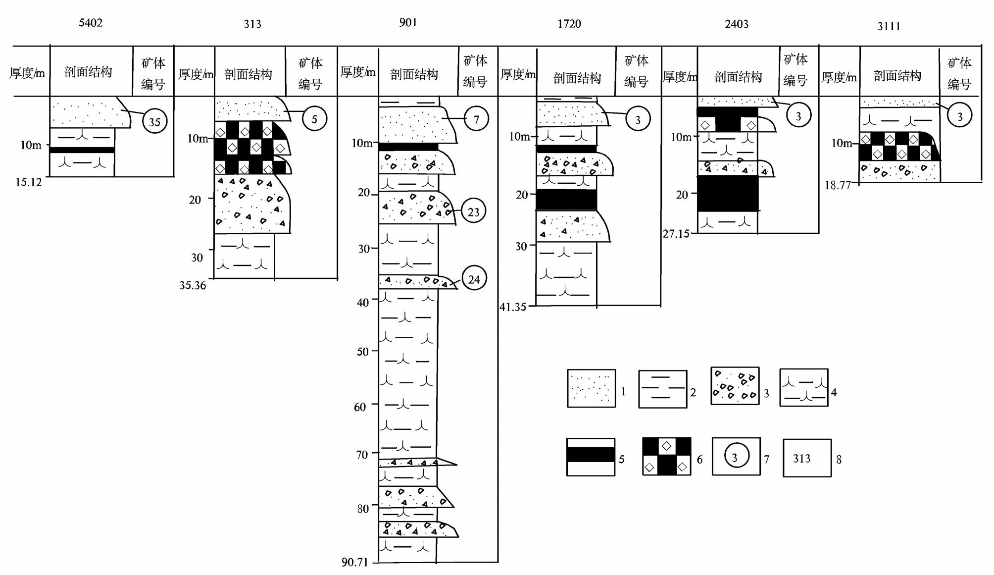 后槽矿区九架炉组在溶蚀洼地中的垂向充填序列及沉积环境(据文献[3, 4]中有关资料编制) 1—块状含砂、砾屑泥-粉晶结构半土状铝土矿(洪泛漫流沉积); 2—块状含粉砂、砂、砾屑泥质结构黏土岩、铝土岩(洪泛漫流沉积); 3—块状砂、砾级碎屑结构铝土矿(似泥石流沉积); 4—块状含粉砂、砂级碎屑泥质结构黏土岩、铝土岩、致密状铝土矿(沼泽沉积); 5—块状煤、炭质黏土岩、炭质铝土岩(泥炭沼泽沉积); 6—块状碎屑结构炭质铝土矿、铝土岩(似泥石流冲入泥炭沼泽中的沉积); 7—矿体编号; 8—钻孔编号(钻孔平面位置见图1) Fig.6 The vertical infilling sequence and depositional environment of Jiujialu Formation in corroded depression in the Houcao mining area(modified after references[3, 4]) 1-Massive clay-powder crystal structure semi-earthy bauxite containing sand and rubble - flooding sheetflood deposit; 2-Massive pelitic structure clay rock and bauxitic rock containing silty sand,sand and rubble - flooding sheetflood deposit; 3-Massive clastic bauxite containing sand and rubble - debris flow-like deposit; 4-Massive pelitic structure clay rock,bauxitic rock and dense bauxite containing silty sand,sand - swamp deposit; 5-Massive coal,carbonaceous clay rock,carbonaceous bauxitic rock - peat bog deposit; 6-Massive clastic carbonaceous bauxite,bauxitic rock - debris flow-like washed to peat bog deposit; 7-Serial number of bauxite orebody; 8-Serial number of drill hole (see Fig.1 for plan view of location of drill holes) |